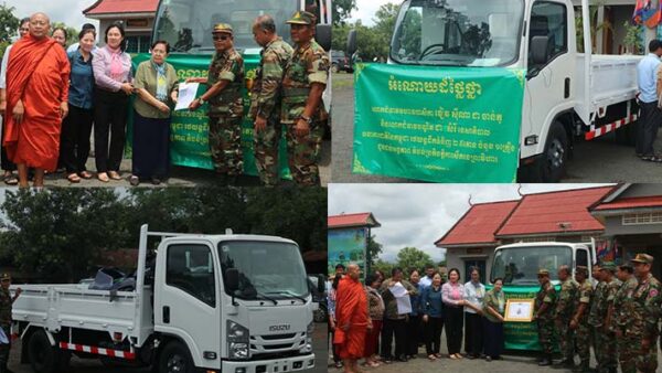 លោកជំទាវ មហាឧបាសិកា ខៀវ ស៊ីណា ជាចាន់តូ និងលោកជំទាវ ជា សិរី ទេសសារភិបាលធនាគារជាតិកម្ពុជា នាំយករថយន្ត និងអាក្រោះ ម៉ូតូប្រគល់ជូនកងទ័ពជួមុខទឹសសមរភូមិកម្ពុជា ថៃ