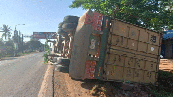 រថយន្តធន់ធំសណ្ដោងកន្ទុយរ៉ឺម៉កដាច់ក្រឡាប់បះជើងលើផ្លូវជាតិដោយសារតែផ្ទុកទំនិញធ្ងន់លើសតោនកំណត់