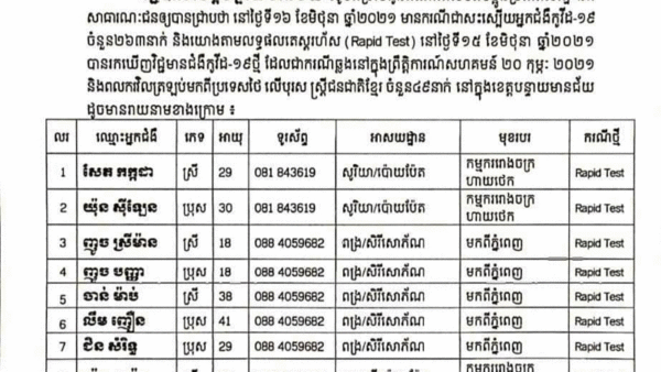 សេចក្តីប្រកាស់ព័ត៌មានរបស់រដ្ឋាលខេត្តកំពង់ឆ្នាំងស្តីពីកាបន្តរកឃើញអ្នកវិជ្ជមាន.19ចំនួន9នាកើថ្មីបន្ថែម