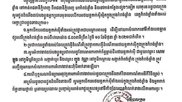 សេចក្តីជូនដំណឹងស្តីពីការផ្អាកធ្វើដំណើរតាមរថយន្តតាកស៉ីទាំងអស់ក្នុងក្រុងកំពង់ឆ្នាំងដែលធ្វើដំណើពីកំពង់ឆ្នាំងទៅកានរាជធានីភ្នំពេញនិងពីរាជធានីភ្នំពេញមកខេត្តកំពង់ឆ្នាំងនិងទៅកានើកន្លែងផ្សេងៗទៀត