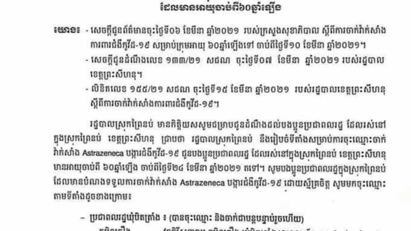 រដ្ឋបាលស្រុកព្រៃនប់សេចក្ដីជូនដំណឹង ស្ដីពីការចុះឈ្មោះចាក់វ៉ាក់សាំង Astrazeneca បង្ការជំងឺកូវីដ-១៩ ជូនប្រជាពលរដ្ឋរស់នៅក្នុងស្រុកព្រៃនប់ ខេត្តព្រះសីហនុ ដែលមានអាយុចាប់ពី៦០ឡើង ៕