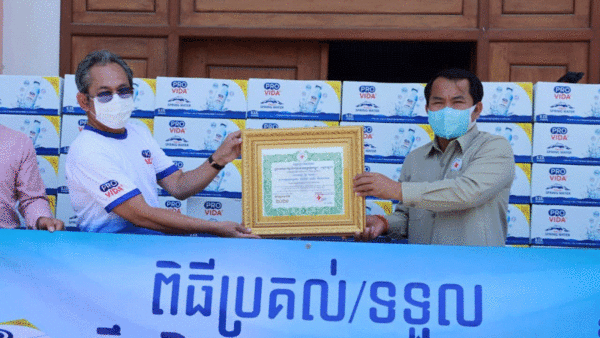 លោកឧកញ៉ាអ៊ឹងប៊ុនហូវនាំយកអំណោយទឹកសុទ្ធនិងថវិកាប្រគល់ជូនសាខាកាកបាទក្រហមកម្ពុជាខេត្តកណ្ដាល