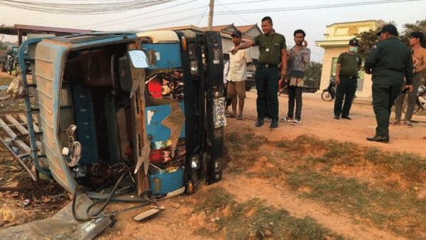 រថយន្តដឹកកម្មករកម្មការនីក្រឡាប់ផ្ងាជើងរងរបួសធ្ងន់ស្រាល៥០នាក់នៅក្រុងបាវិត