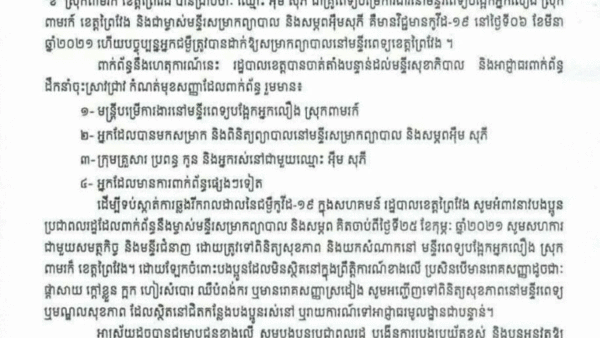រដ្ឋបាលខេត្តព្រៃវែង អំពាវនាវដល់ប្រជាពលរដ្ឋ ដែលពាក់ព័ន្ធគ្រូពេទ្យម្នាក់រកឃើញឆ្លងកូវីដ១៩ ត្រូវមកធ្វើតេស្តរកកូវីដ១៩