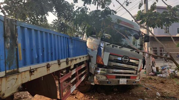 រថយន្តដឹកដំឡូងមី បុករថយន្តដឹកដំឡូងមីពីក្រោយពេញទំហឹង ឡើងរួញក្បាលរថយន្ត តែតៃកុងរងរបួសស្រាល