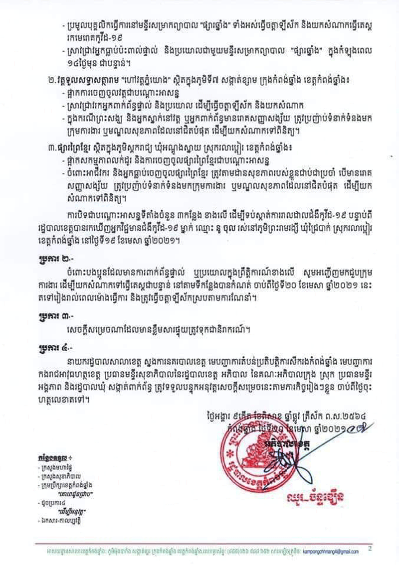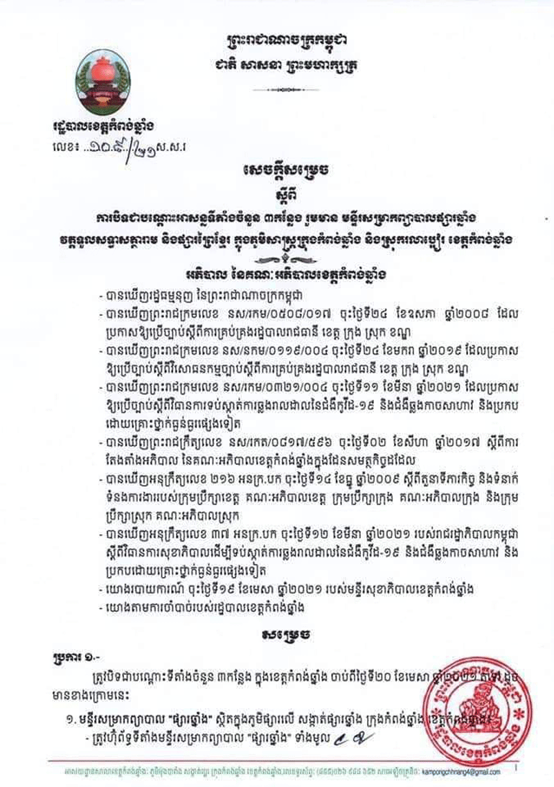 ខេត្តកំពង់ឆ្នាំង:នៅថ្ងៃទី២០មេសា២០២១នេះរដ្ឋបាលខេត្តកំពង់ឆ្នាំងប្រញាប់ចេញសេចក្ដីសម្រេចស្ដីពីការបិទជាបណ្ដោះអាសន្នទីតាំងចំនួន៣កន្លែង រួមមានមន្ទីរសម្រាកព្យាបាលផ្សារឆ្នាំង. វត្តទួលសទ្ធាសត្ថារាម .និងផ្សារព្រៃខ្មែរ ក្នុងភូមិសាស្ត្រក្រុង និងស្រុករលាប្អៀរ ខេត្តកំពង់ឆ្នាំង បន្ទាប់ពីបុរសម្នាក់ដែលស្លាប់ដោយសារជម្ងឺកូវិដ១៩គ្រាដែលបុរសនោះមានការចេញចូលទីតាំងទាំង៣កន្លែងខាងលើនេះផងដែរ ៕អ្នកស្រីសានផល្លា