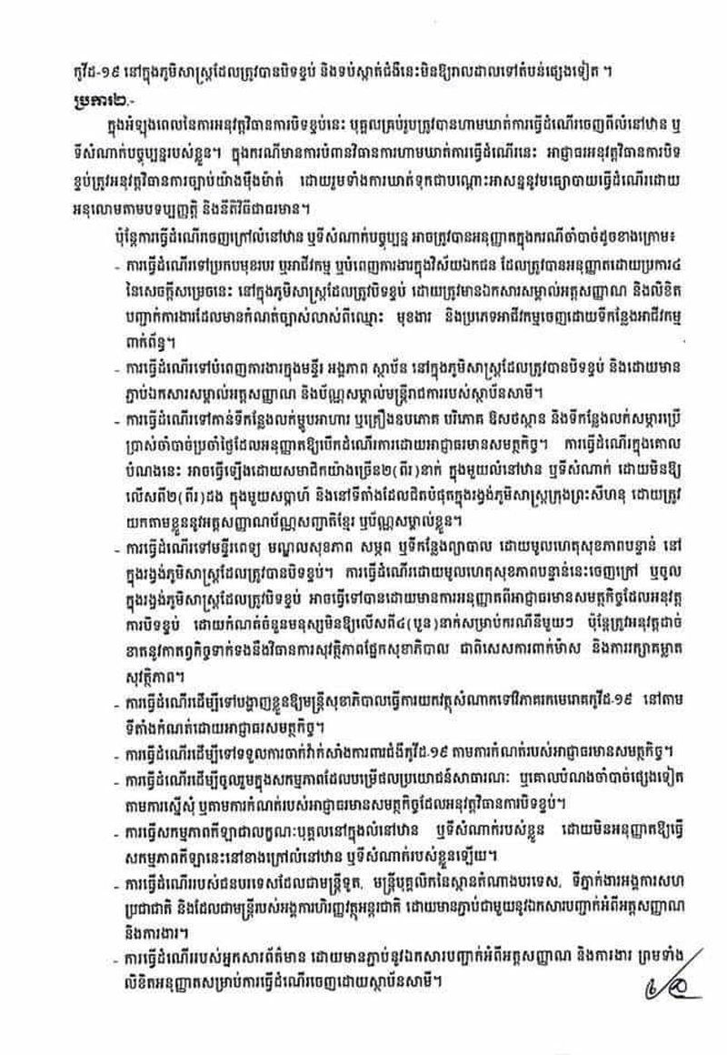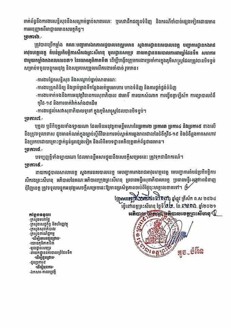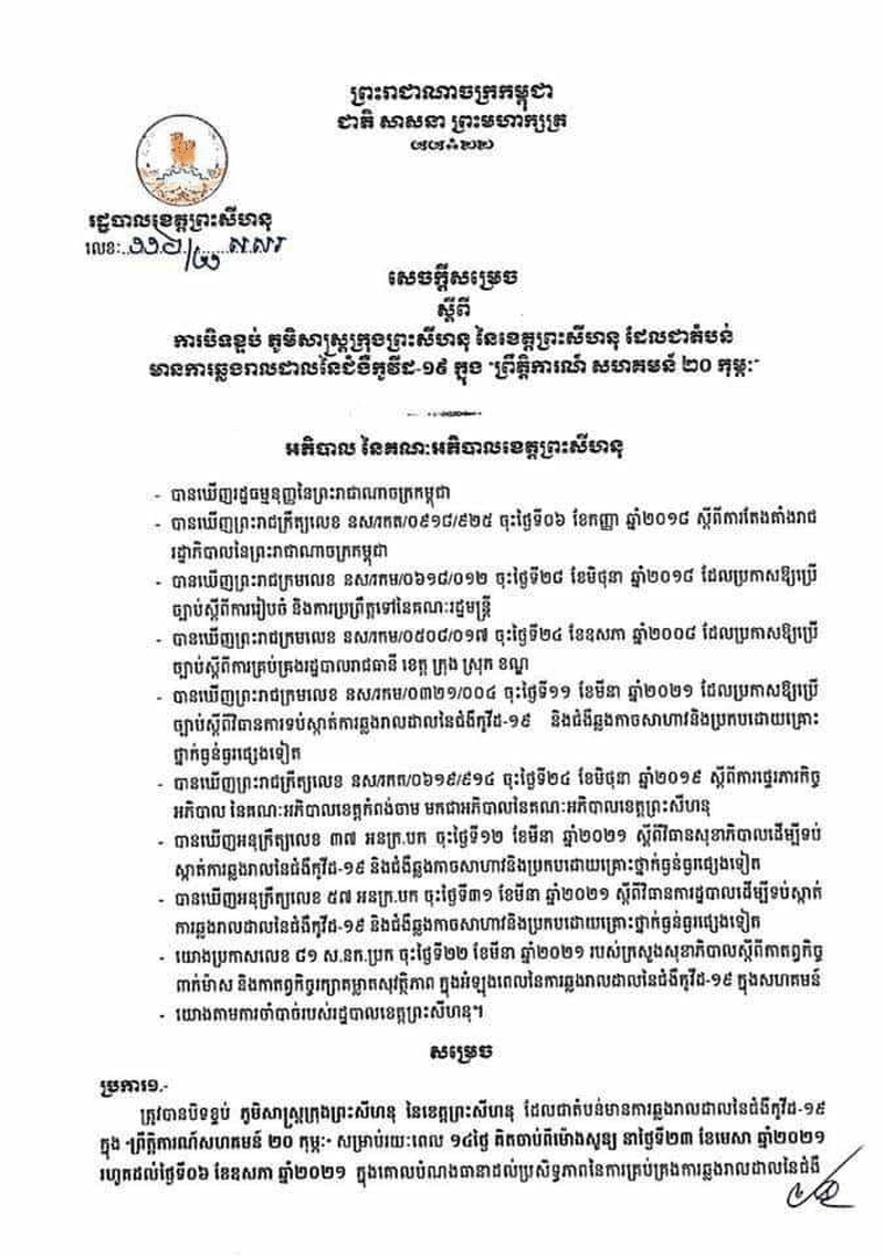 អភិបាលខេត្តព្រះសីហនុ លោក គួច ចំរើន បានចុះហត្ថលេខាលើលិខិតមួយ កាលពីថ្ងៃទី២២មេសា ម្សិលមិញថា ក្រុងព្រះសីហនុត្រូវបានបិទខ្ទប់១៤ថ្ងៃ គិតចាប់តាំងម៉ោងសូន្យ ថ្ងៃទី២៣មេសា ដល់ថ្ងៃទី៦ឧសភា ២០២១ ដោយមូលហេតុ មានអ្នកឆ្លងរាលដាលជំងឺកូវីដ១៩ ។ លើសពីនេះអាជា្ញធរមានសមត្ថកិច្ចនិងមានវិធានការក្ដៅចំពោះជនណាដែលបំពានបំរាមឬបង្ករបញ្ហាពាក់ព័ន្ធនិងកូវីដ១៩ ៕SPS