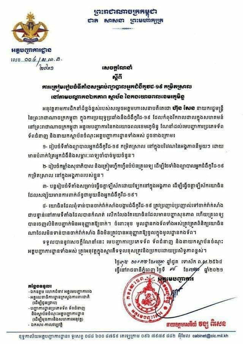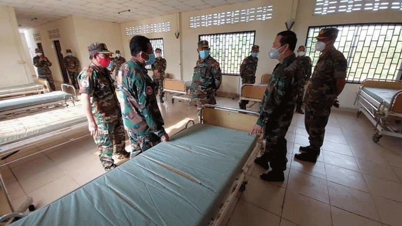ព្រះវិហារៈ នៅថ្ងៃទី២២ ខែមេសា ឆ្នាំ២០២១ ឯកឧត្ដម ឧត្តមសេនីយ៍ឯក ស្រី ឌឹក មេបញ្ជាការរង កងទ័ពជើងគោក មេបញ្ជាការ កងពលធំអន្តរាគមន៍លេខ៣ ព្រមទាំងក្រុមការងារ បានអញ្ជើញចុះ ត្រួតពិនិត្យទីតាំងគិលានដ្ឋាន កងពលធំអន្តរាគមន៍លេខ៣ និងគិលានដ្ឋាន កងពលតូច អន្តរាគមន៍លេខ៧ ដើម្បីត្រៀមរៀបចំទីតាំងសម្រាប់ព្យាបាលអ្នកជំងឺកូវិដ-១៩កម្រិតស្រាល និងកន្លែងសម្រាប់ធ្វើចត្តាឡីស័កតាមបណ្តាកងឯកភាព និងផ្សព្វផ្សាយសេចក្តីណែនាំ របស់អគ្គបញ្ជាការដ្ឋាន នៃកងយោធពលខេមរភូមិន្ទលេខ០០៤ ស.ណ.ន.ស្តីពីការត្រៀមរៀប ចំទីតាំងសម្រាប់ព្យាបាលអ្នកជំងឺកូវិដ-១៩ កម្រិតស្រាលនៅតាមបណ្តាកងឯកភាព ស្ថាប័ន នៃកងយោធពលខេមរភូមិន្ទ ដែលជាការអនុវត្តតាមការដឹកនាំដ៏ខ្ពង់ខ្ពស់របស់ សម្តេចអគ្គមហាសេនា បតីតេជោ ហ៊ុន សែន នាយករដ្ឋមន្ត្រី នៃព្រះរាជាណាចក្រកម្ពុជា ក្នុងការប្រយុទ្ធប្រឆាំងនឹងជំងឺកូវីដ-១៩ ដែលកំពុងរីករាលដាលក្នុងសហគមន៍នៅព្រះរាជាណាចក្រកម្ពុជា។ សូមជម្រាបថា តាមសេចក្តីណែនាំរបស់ អគ្គមេបញ្ជាការនៃកងយោធពលខេមរភូមិន្ទ ណែនាំដល់មេបញ្ជាការ ប្រភេទទ័ព ទ័ពជំនាញ និងនាយកស្ថាប័នចំណុះអគ្គបញ្ជាការដ្ឋានទាំងអស់ រៀបចំទីតាំងព្យាបាល អ្នកជំងឺកូវីដ-១៩ កម្រិតស្រាលនៅក្នុងបរិវេណនៃអង្គភាពនីមួយៗ ដោយមានបំពាក់គ្រែអ្នកជំងឺ និងសម្ភារៈពេទ្យចាំបាច់មួយចំនួន ។ ត្រូវរៀបចំកម្លាំងសុខាភិបាល និងត្រៀមហ្វឹកហ្វឺនបំប៉នគ្រូពេទ្យ ដើម្បីថែទាំនិងព្យាបាលអ្នកជំងឺកូវីដ-១៩ កម្រិតស្រាល នៅក្នុងអង្គភាពរបស់ខ្លួន និងបន្តរៀបចំទីតាំងសម្រាប់ធ្វើចត្តាឡីស័កដោយឡែកនៅក្នុងអង្គភាព ដើម្បីធ្វើចត្តាឡីស័ក ដល់យោធិន ដែលសង្ស័យមានការពាក់ព័ន្ធជាមួយនឹងអ្នកជំងឺកូវីដ-១៩។ លើសពីនេះយោធិនដែលពុំទាន់បានចាក់វ៉ាក់សាំងបង្ការជំងឺកូវីដ-១៩ ត្រូវប្រញាប់ប្រញាល់ទៅចាក់ វ៉ាក់សាំងជាបន្ទាន់នៅតាមទីតាំងដែលបានកំណត់លើកលែងតែយោធិនដែលមានបញ្ហាសុខភាព ហើយគ្រូពេទ្យបានចេញលិខិតបញ្ជាក់មិនអនុញ្ញាតឱ្យចាក់។ ចំពោះមុខ មូលដ្ឋានកងទ័ពទាំង អស់ត្រូវត្រួតពិនិត្យយោធិនណាដែលមិនទាន់បានចាក់វ៉ាក់សាំង, នឹងមិនត្រូវបានអនុញ្ញាតឱ្យចូល ក្នុងមូលដ្ឋានកងទ័ពទេ៕SPS