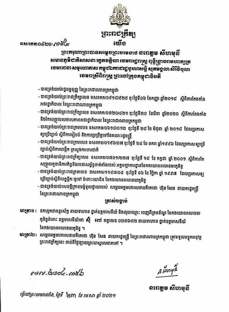 យោងតាមព្រះរាជក្រឹត្យរបស់ព្រះមហាក្សត្រ ឡាយព្រះហស្ថលេខានៅថ្ងៃទី២៣មេសា២០២១ ថា លោក ឧត្តមសេនីយ៍ទោ ស៊ុ ពៅ អត្តលេខ ០២៣៦៣២ ត្រូវបានដកហូតឋានន្តរសក្តិ ជានាយទាហ៊ាន ថ្នាក់ឧត្តមសេនីយ៍ និងលុបឈ្មោះចេញពីក្របខ័ណ្ឌនៃកងយោធពលខេមរភូមិន្ទ ។
