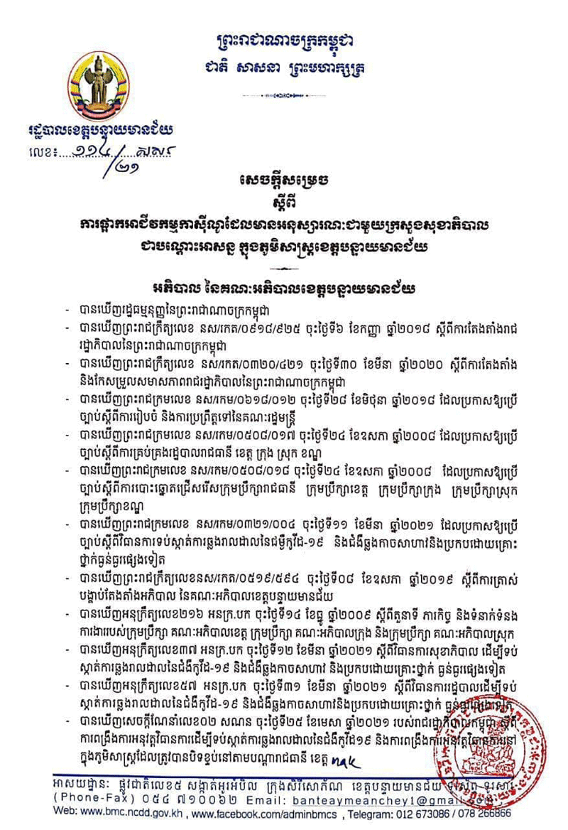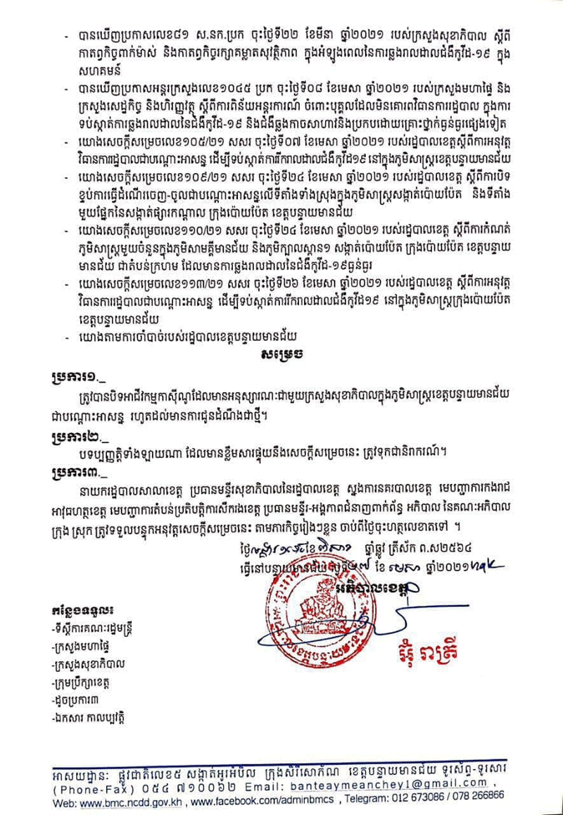 ខេត្តបន្ទាយមានជ័យ៖រដ្ឋបាលខេត្តបន្ទាយមានជ័យប្រកាសឲ្យផ្អាកអាជីវកម្មកាស៊ីណូទាំងអស់នៅក្នុងភូមិសាស្ត្រខេត្តបន្ទាយមានជ័យ ដើម្បីទប់ស្កាត់ការរីករាលដាលនៃជំងឺកូវីដ១៩ ដោយផ្អាកចាប់ពីថ្ងៃទី២៧ ខែមេសា ឆ្នាំ២០២១នេះតទៅ លើកាស៊ីណូដែលមានអនុសារណៈជាមួយក្រសួងសុខាភិបាលជាបណ្ដោះអាសន្ន ក្នុងភូមិសាស្ត្រខេត្តបន្ទាយមានជ័យ រហូតដល់មានការជូនដំណឹងជាថ្មី ។