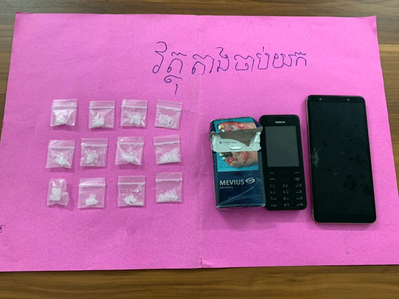 វត្ថុតាងចាប់យកមាន ១-ម្សៅក្រាមសថ្លាសង្ស័យជាសារធាតុញៀនម៉ាទឹកកកចំនួន១២កញ្ចប់តូច,២-ម៉ូតូហុងដាឌ្រីម ស៊េរី២០២០ពណ៌ខ្មៅ មានស្លាកលេខ 1AI-7332ចំនួន ០១គ្រឿង,៣-ទូរស័ព្ទដៃចំនួន០២គ្រឿងមាន ម៉ាកSAMSUNGពណ៌ទឹកមាសចំនួន ០១គ្រឿង,ម៉ាក NOKIA ចុចពិល ពណ៌ខ្មៅ ចំនួន០១គ្រឿងនិង៤-កាបូបតូច ពណ៌ខ្មៅចំនួន០១។