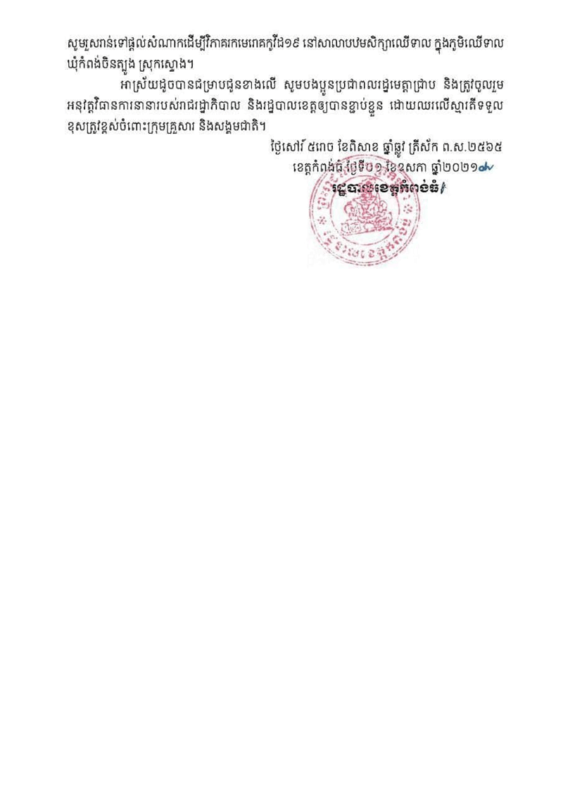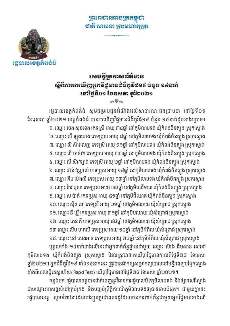 រដ្ឋបាលខេត្តកំពង់ធំ បានបញ្ជាក់ថា ប្រជាពលរដ្ឋដែលទើបរកឃើញវិជ្ជមានជំងឺកូវីដ១៩នេះ រស់នៅមូលដ្ឋានឃុំកំពង់ចិនត្បូង និងឃុំសំព្រោជ ស្រុកស្ទោង ដែលបានប៉ះពាល់ផ្ទាល់ ជាមួយអ្នកវិជ្ជមានម្នាក់ កាពីថ្ងៃទី២៨ ខែមេសា ឆ្នាំ២០២១កន្លងទៅ។ បច្ចុប្បន្នអ្នកជំងឺកូវីដទាំង១៤នាក់នេះ ត្រូវបានដាក់ឲ្យសម្រាកព្យាបាលនៅមន្ទីរពេទ្យបង្អែកស្ទោង។