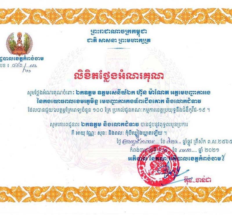 កំពង់ចាម : បុត្រា សម្តេច អគ្គមហាសេនាបតី តេជោ ហ៊ុន សែន នាយករដ្ឋមន្ត្រី កម្ពុជា គឺឯកឧត្តម ឧត្តមសេនីយ៍ឯក ហ៊ុន ម៉ាណែត អគ្គមេបញ្ជាការរង នៃកងយោធពលខេមរភូមិន្ទ មេបញ្ជាការកងទ័ពជើងគោក និងលោកជំទាវ បានជួយឧបត្ថម្ភគ្រែពេទ្យចំនួន ១០០គ្រែ និង ឯកឧត្តម ឧត្តមសេនីយ៍ឯក ហ៊ុន ម៉ានិត អគ្គនាយក នៃអគ្គនាយកដា្ឋនស្រាវជ្រាវចារកិច្ច ក្រសួងការពារជាតិ និងលោកជំទាវ បានជួយឧបត្ថម្ភគ្រែពេទ្យចំនួន ១៥០គ្រែ សម្រាប់ មន្ទីរពេទ្យ មេគង្គ កំពង់ចាម ដែល នឹង ចាប់ផ្ដើម បេីក ដំណើរការ ព្យាបាល អ្នក វិជ្ជមាន កូវីដ -១៩ ជូនបងប្អូន ប្រជាពលរដ្ឋ ក្នុង ខេត្តកំពង់ចាម និង ខេត្តត្បូងឃ្មុំ នៅ ដើម ខែ ឧសភា ឆ្នាំ ២០២១ នេះ ។