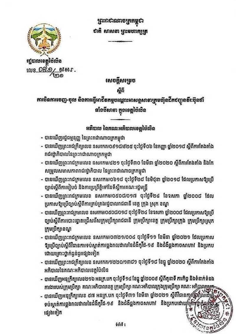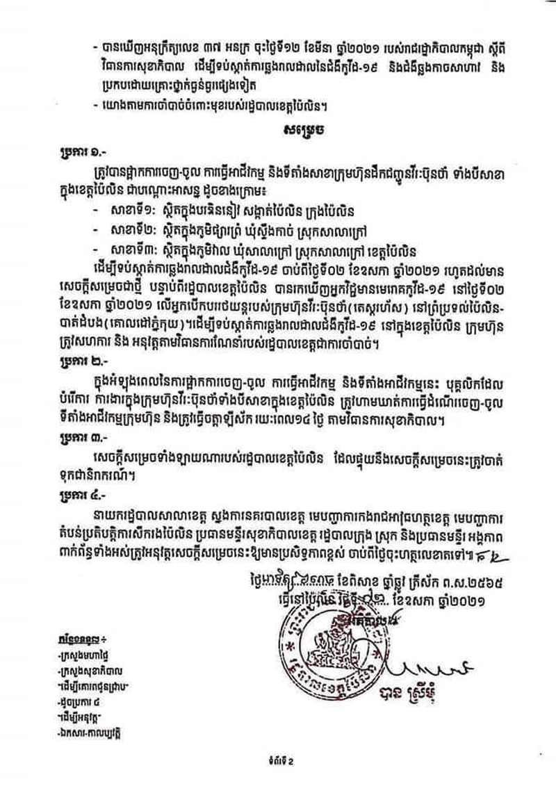 បើយោងតាមសេចក្តីសម្រេចរបស់រដ្ឋបាលខេត្តប៉ៃលិន លេខ០៥១/២១ សសរ. ចុះថ្ងៃអាទិត្យ ៦រោច ខែពិសាខ ឆ្នាំឆ្លូវ ត្រីស័ក ព.ស.២៥៦៥ ត្រូវនឹងទី០២ ខែឧសភា ឆ្នាំ២០២១ ត្រូវបានផ្អាកការ ចេញចូល ការធ្វើអាជីវកម្ម និងទីតាំងសាខាក្រុមហ៊ុនដឹកញ្ជូនវីរ:ប៊ុនថាំទាំង៣សាខា ក្នុងខេត្តប៉ៃលិន ជា បណ្តោះអាសន្នដូចខាងក្រោម ៖