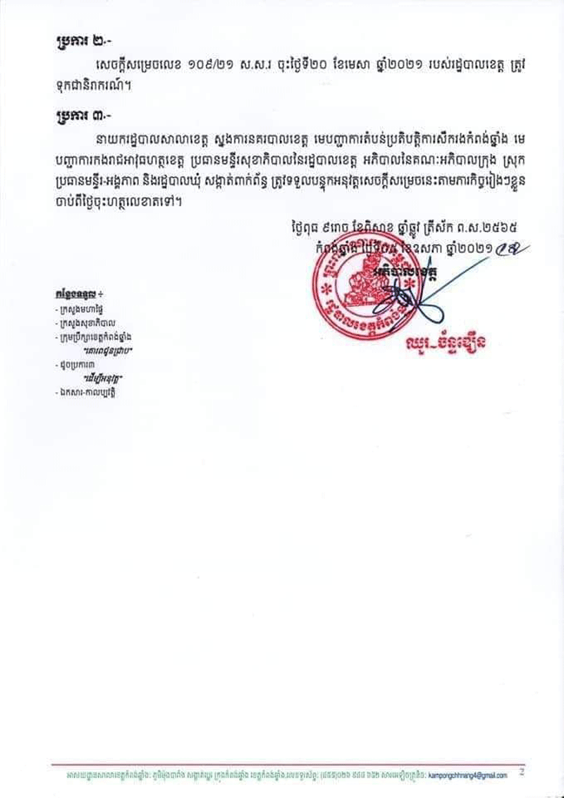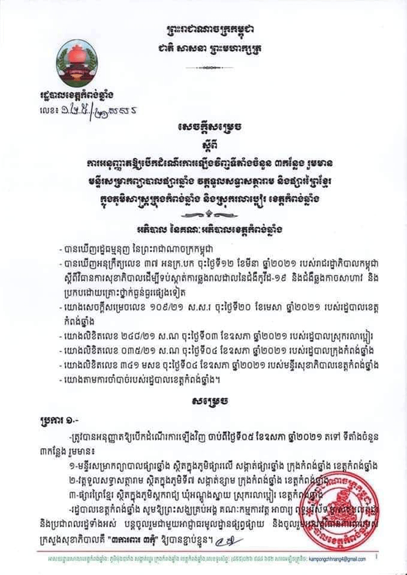ខេត្តកំពង់ឆ្នាំង:រដ្ឋបាលខេត្តកំពង់ឆ្នាំង ចេញសេចក្តីសម្រេចស្តីពីការអនុញ្ញាតឱ្យបើកដំណើរការឡើងវិញ ទីតាំងចំនួន ០៣កន្លែង រួមមាន៖ មន្ទីរសម្រាកព្យាបាលផ្សារឆ្នាំង .វត្តទួលសន្ធាសត្ថារាម .ស្ថិតក្នុងភូមិសាស្រ្ត ក្រុងកំពង់ឆ្នាំង និងផ្សារព្រៃខ្មែរ .ស្ថិតក្នុងភូមិសាស្ត្រស្រុករលាប្អៀរ ខេត្តកំពង់ឆ្នាំង ចាប់ពីថ្ងៃទី៥ ខែឧសភា ឆ្នាំ២០២១ នេះទៅ។