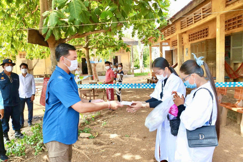 បន្ទាប់មក ឯកឧត្តម ជាម ច័ន្ទសោភ័ណ បន្តចុះសួរសុខទុក្ខ ប្រជាពលរដ្ឋដែលកំពុងធ្វើចត្តាឡីស័ក និងក្រុមគ្រូពេទ្យ ចំនួន ២ទីតាំងក្នុងស្រុកអូររាំងឪ ដោយចែកជូនថវិការក្នុងម្នាក់២មុឺនរៀល និងសំណេះសំណាលកោតសរសើរដល់អាជ្ញាធរស្រុក ដោយក្នុងនោះឧបត្តម្ភលើកទឹកចិត្តដល់កងម្លាំងចំនួន៤០នាក់ អង្ករ៤បេ ត្រីខ២កេសធំ មី១០កេស ទឹកសុទ្ធ២០កេស ម៉ាសនិងអាល់កុល ៤០កញ្ចប់ ព្រមទាំងថវិការចំនួន៨០ម៉ឺនរៀលផងដែរ ៕