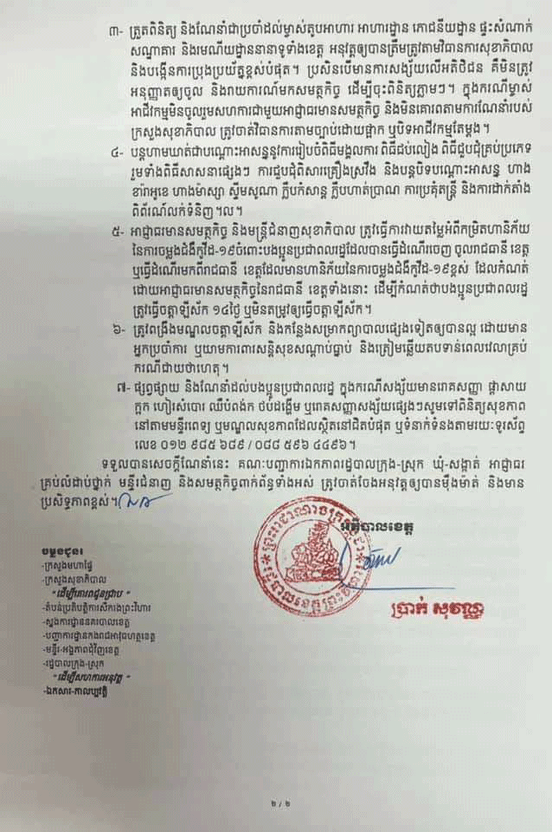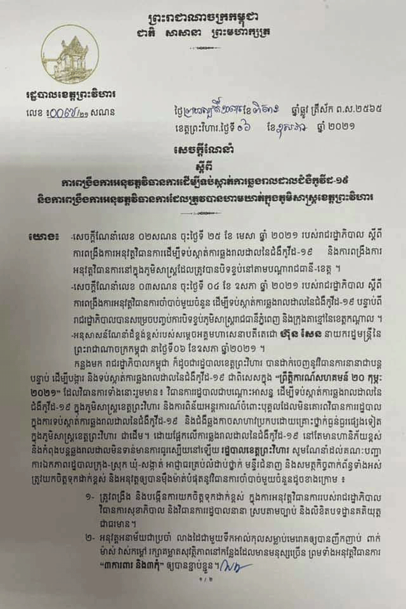 ព្រះវិហារ៖ រដ្ឋបាលខេត្តព្រះវិហារ ឯកឧត្តម ប្រាក់ សុវណ្ណ អភិបាលខេត្ត ព្រះវិហារ ចេញ សេចក្តីណែនាំ លេខ០០៧ សណន ចុះថ្ងៃទី០៦ ខែឧសភា ឆ្នាំ ២០២១ ស្តីពីការ ពង្រឹងការអនុវត្តវិធានការ ដើម្បីទប់ស្កាត់ការឆ្លងរាលដាល នៃជំងឺកូវីដ-១៩ និងការពង្រឹងការអនុវត្តវិធានការ ដែលត្រូវបានហាមឃាត់ក្នុងភូមិសាស្ត្រខេត្តព្រះវិហារ។