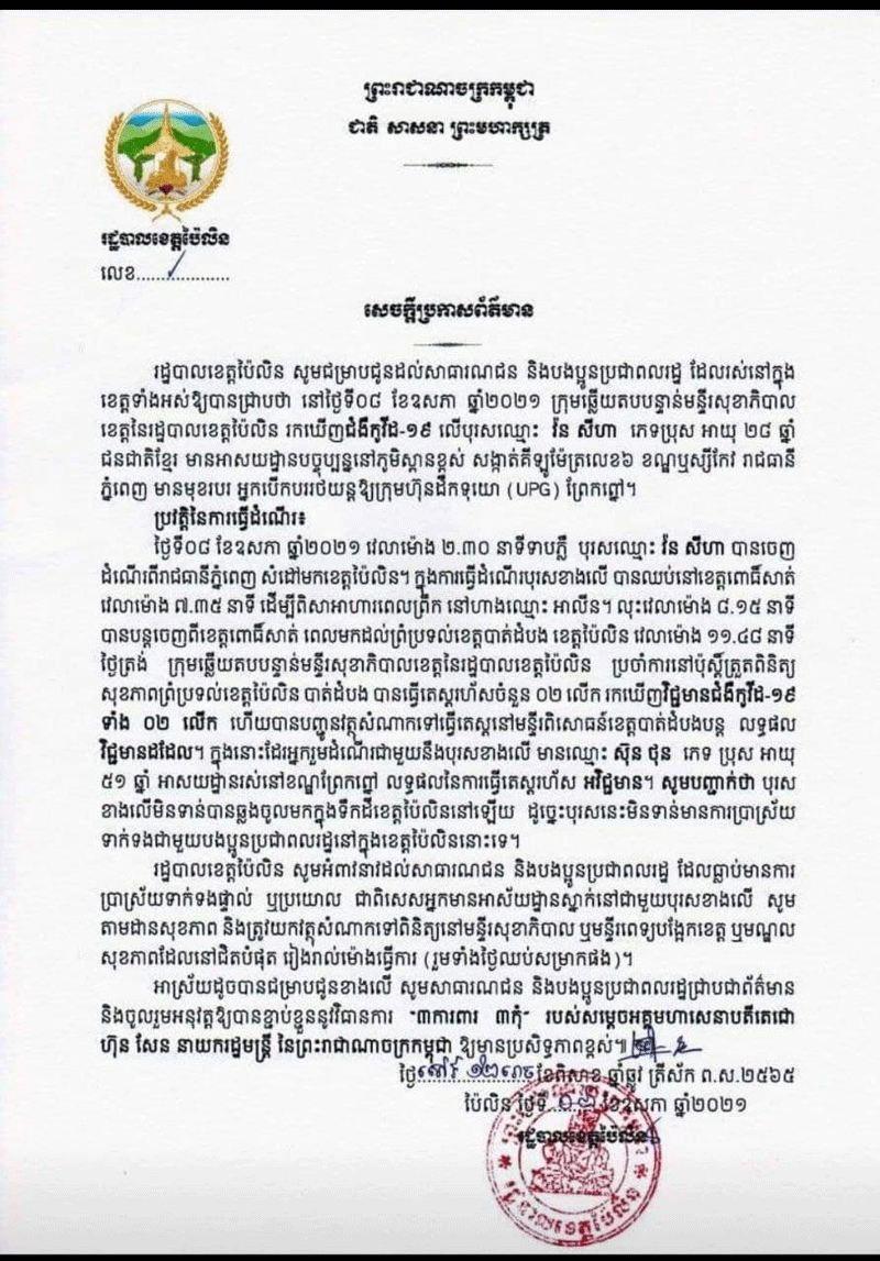 សេចក្តីប្រកាសព័ត៌មានក្នុងលិខិតបានបញ្ជាក់ថា ៖ នៅថ្ងៃទី០៨ ខែឧសភា ឆ្នាំ២០២១ វេលាម៉ោង២ និង៣០នាទី ទាបភ្លឺ បុរស ឈ្មោះ វ៉ន សីហា បានចេញដំណើរពីរាជធានីភ្នំពេញ សំដៅមកខេត្តប៉ៃលិន ។ ក្នុងការធ្វើដំណើរ បុរសខាងលើ បានឈប់នៅខេត្តពោធិ៍សាត់ វេលាម៉ោង៧ និង៣៥នាទីព្រឹក ដើម្បីពិសាអាហារពេលព្រឹក នៅហាង ឈ្មោះ អាលីន ។ លុះវេលាម៉ោង៨ និង១៥នាទី បានបន្តចេញពីខេត្តពោធិ៍សាត់ ពេលមកដល់ព្រំប្រទល់ខេត្តបាត់ដំបង ខេត្តប៉ៃលិន វេលាម៉ោង១១ និង៤៨នាទីថ្ងៃត្រង់ ក្រុមឆ្លើយតបបន្ទាន់មន្ទីរសុខាភិបាលខេត្ត នៃរដ្ឋបាលខេត្តប៉ៃលិន ប្រចាំការនៅប៉ុស្តិ៍ត្រួតពិនិត្យ សុខភាពព្រំប្រទល់ខេត្តប៉ៃលិន បាត់ដំបង បានធ្វើតេស្តរហ័សចំនួន០២លើក រកឃើញវិជ្ជាមានជំងឺកូវីដ-១៩ ទាំង ០២លើក ហើយបានបញ្ជូនវត្ថុសំណាកទៅធ្វើតេស្តនៅមន្ទីរពិសោធន៍ ខេត្តបាត់ដំបង បន្តលទ្ធផល វិជ្ជមានដដែល ។ ក្នុងនោះដែរ អ្នករួមដំណើរជាមួយនឹងបុរសខាងលើ មានតេស្តរហ័ស អវិជ្ជមាន ។