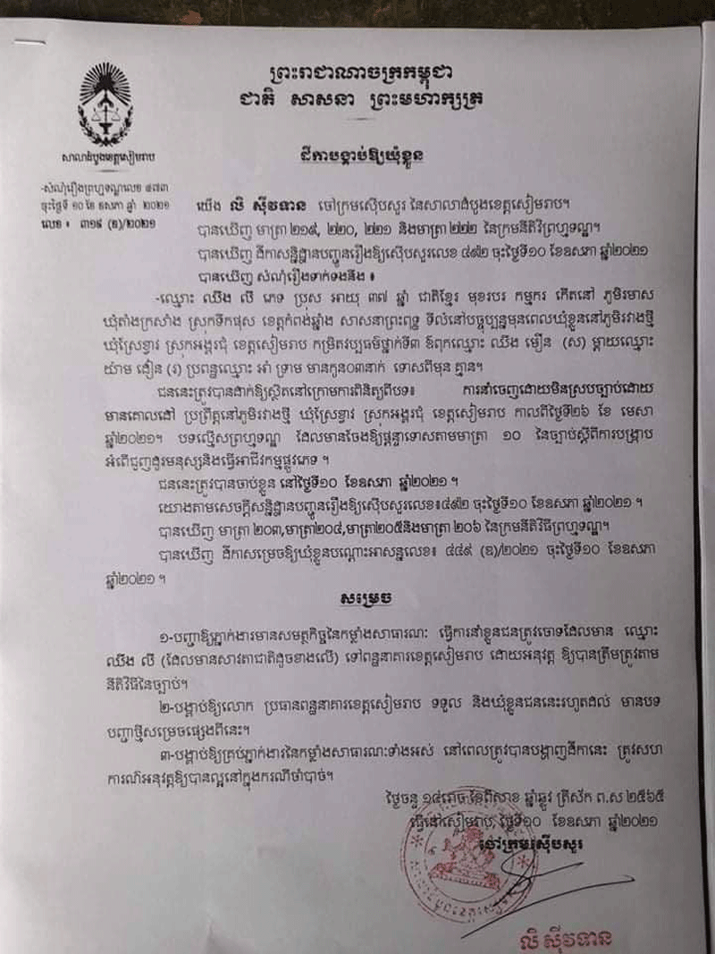 សមត្ថកិច្ចនគរបាលខេត្តសៀមរាប បានឲ្យដឹងថា នៅថ្ងៃទី១០ ខែឧសភា ឆ្នាំ២០២១ម្សិលមិញនេះ ចៅក្រមស៊ើបសួរ នៃសាលាដំបូងខេត្តសៀមរាប បានសម្រេចធ្វើការចោទប្រកាន់មនុស្សចំនួន០២នាក់ដែលត្រូវជាប្ដីប្រពន្ធនឹងគ្នា គឺ១. ឈ្មោះ ឈឹង លី ភេទ ប្រុស អាយុ ៣៧ឆ្នាំ ត្រូវជាប្ដី និង ២- ឈ្មោះ អាំ ទ្រាម ភេទ ស្រី អាយុ ៣៦ឆ្នាំ ត្រូវជាប្រពន្ធ មានទីលំនៅភូមិរវៀងថ្មី ឃុំស្រែខ្វាវ ស្រុកអង្គរជុំ ខេត្តសៀមរាប ពីបទការនាំចេញដោយមិនស្របច្បាប់ដោយមានគោលដៅ ព្រមទាំងបង្គាប់ឲ្យឃុំខ្លួនទៀតផង ខណៈដែលអ្នកទាំងពីរនាក់នេះ ជាប់សង្ស័យជាមេខ្យល់នាំពលករខ្មែរទៅធ្វើការនៅប្រទេសថៃដោយខុសច្បាប់ ដែលប្រព្រឹត្តទៅកាលថ្ងៃទី២៦ ខែមេសា ឆ្នាំ២០២១កន្លងទៅនេះ នៅចំណុចម្ដុំច្រកចំការចេក ក្នុងខេត្តបន្ទាយមានជ័យ ។