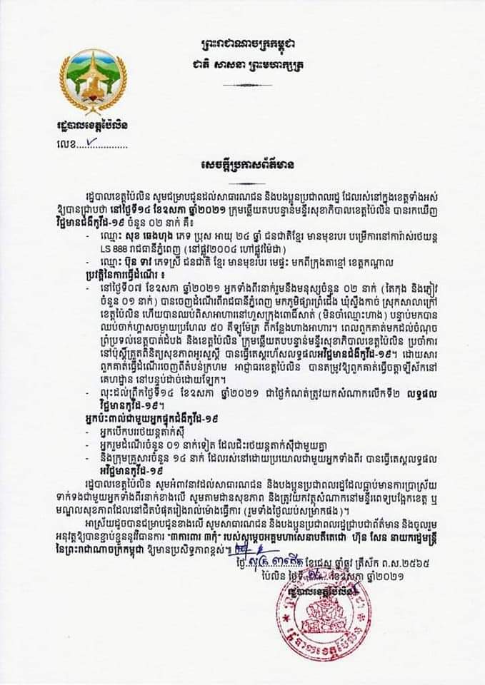 ខេត្តប៉ៃលិន ៖ បន្ទាប់ពីមន្រ្តី នៃមន្ទីរសុខាភិបាល និងក្រុមការងារ ប្រចាំការនៅតាមគោលដៅព្រំប្រទល់នីមួយៗ នៃខេត្តប៉ៃលិន និងខេត្តបាត់ដំបង ដើម្បីធ្វើការពិនិត្យទៅលើអ្នកដំណើរចេញចូល ស្រា ប់តែក្រោយមកឃើញមានមនុស្ស២នាក់ បានផ្ទុកមេរោគកូវីដ-១៩ ទើបរដ្ឋបាលខេត្តប៉ៃលិន បានចេញសេចក្តីប្រកាសព័ត៌មាន នៅថ្ងៃសុក្រ ៣កើត ខែជេស្ឋ ឆ្នាំឆ្លូវ ត្រីស័ក ព.ស.២៥៦៥ ត្រូវនឹងថ្ងៃទី១៤ ខែឧសភា ឆ្នាំ២០២១ សូមឱ្យមានការប្រុងប្រយ័ត្នខ្ពស់ ទាំងអស់គ្នា ដើម្បីទប់ស្កាត់ការរីករាលដាលនៃជំងឺ ដ៏កាចសាហាវមួយនេះ ។