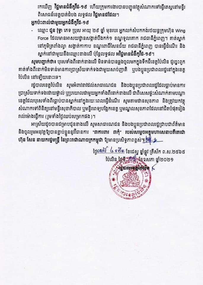 ខេត្តប៉ៃលិន ៖ កាលពីថ្ងៃទី១៥ ឧសភា ២០២១ យោងតាមសេចក្តីប្រកាសព័ត៌មានរបស់រដ្ឋាភិបាលខេត្តប៉ៃលិន បានឱ្យដឹងថា ៖ កាលពីថ្ងៃទី១៤ ឧសភា ២០២១ ក្រុមឆ្លើយតបបន្ទាន់ នៃមន្ទីរសុខាភិបាលខេត្ត បានរកឃើញវិជ្ជមាន ជំងឺកូវីដ-១៩ លើឈ្មោះ គេង រ៉ាវី ភេទប្រុស អាយុ២៦ឆ្នាំ មានអាស័យដ្ឋាន នៅសង្កាត់បឹងកក់១ ខណ្ឌទួលគោក រាជធានីភ្នំពេញ មុខរបរ អ្នកលក់សំបកកង់រថយន្តក្រុមហ៊ុន Wing Force ។