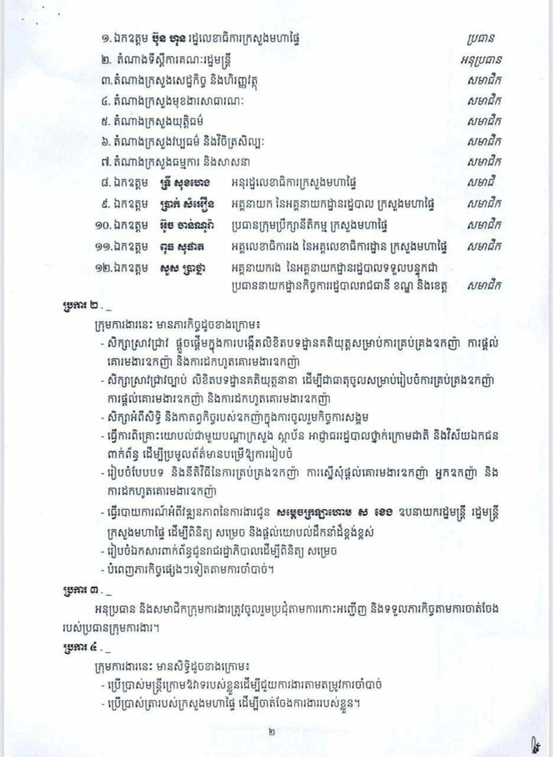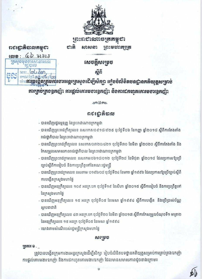 នាយករដ្ឋមន្ត្រីកម្ពុជា សម្ដេចតេជោ ហ៊ុន សែន បានចេញសេចក្តីសម្រេច ស្តីពីការបង្កើតក្រុមការងារអន្តរក្រសួង ដើម្បីសិក្សា រៀបចំលិខិតបទដ្ឋានគតិយុត្ត សម្រាប់ការគ្រប់គ្រងឧកញ៉ា ការផ្តល់គោរមងារឧកញ៉ា និងការដកហូតគោរមងារឧកញ៉ា ៕