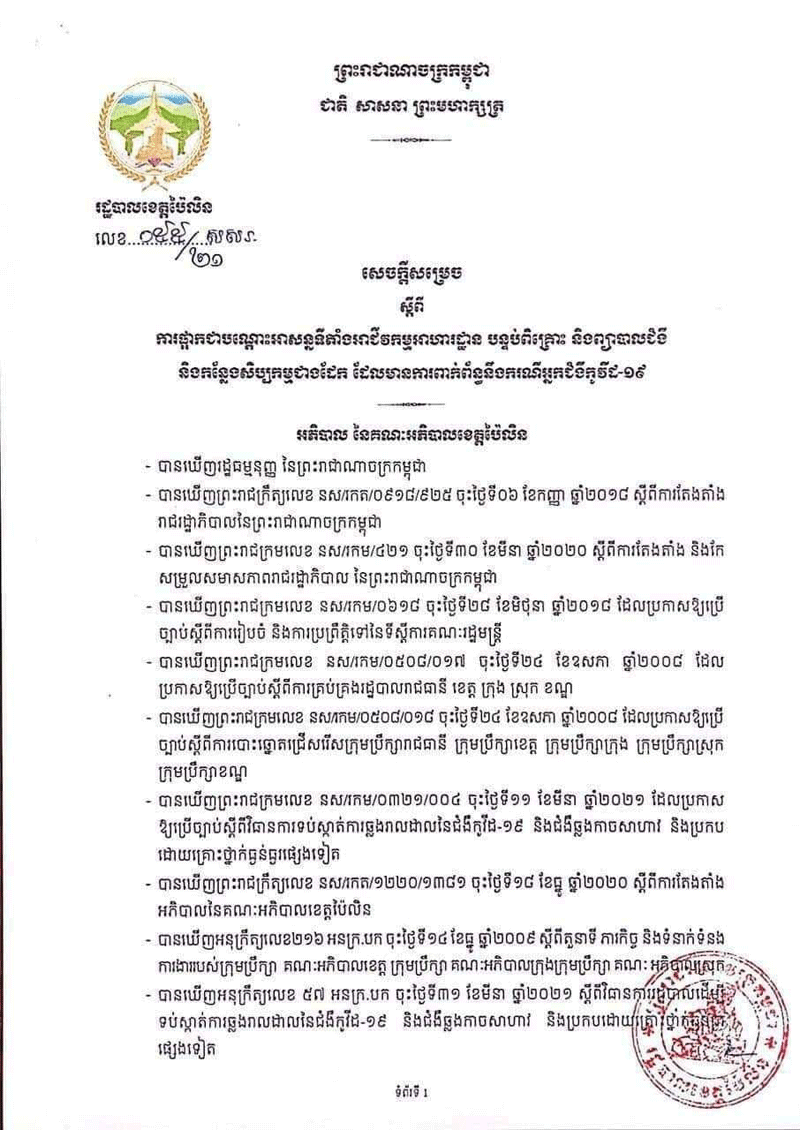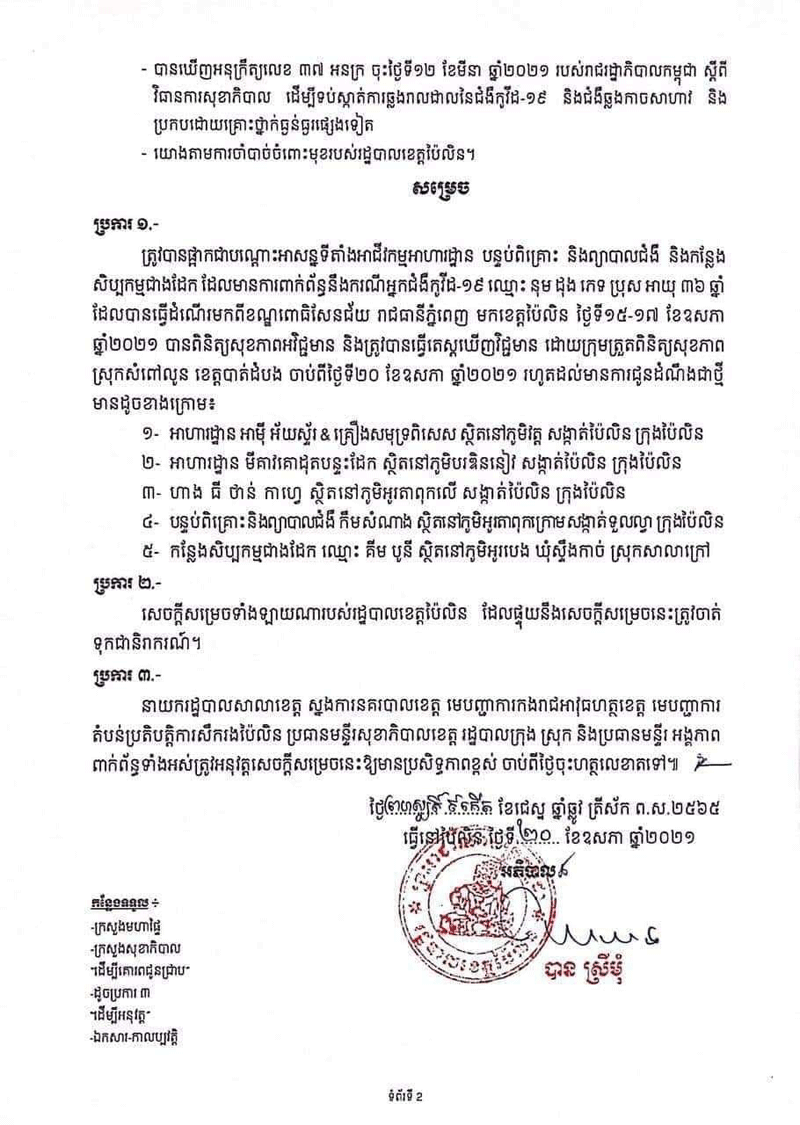 ខេត្តប៉ៃលិន ៖ នៅថ្ងៃទី២០ ខែឧសភា ឆ្នាំ២០២១នេះ រដ្ឋបាលខេត្តប៉ៃលិន បានចេញសេចក្តីសម្រេច មួយ ដោយផ្អាកជាបណ្តោះអាសន្ន ទីតាំងអាជីវកម្មអាហារដ្ឋាន បន្ទប់ពិគ្រោះ និងព្យាបា លជំងឺ កន្លែងសិប្បកម្មជាងដែក ដែលមានការជាប់ពាក់ព័ន្ធនឹងករណីអ្នកជំងឺកូវីដ-១៩ ដែលបុរសម្នាក់ ឈ្មោះ នុម ដុង ភេទប្រុស អាយុ៣៦ឆ្នាំ បានធ្វើដំណើរមកពីខណ្ឌពោធិ៍សែនជ័យ រាជធានីភ្នំ ពេញ មកខេត្តប៉ៃលិន កាលពីថ្ងៃទី១៥-១៧ ខែឧសភា ឆ្នាំ២០២១ ដោយមន្រ្តីសុខាភិបាល បានពិនិត្យសុខភាពអវិជ្ជមាន និងត្រូវបានធ្វើតេស្តបន្តទៀត ឃើញវិជ្ជមានជំងឺកូវីដ-១៩ ដោយក្រុមត្រួតពិនិត្យសុខភាព ស្រុកសំពៅលូន ខេត្តបាត់ដំបង ។ ហេតុនេះ កន្លែងទាំងអស់ខាងលើ នឹងត្រូវបិទចាប់ពីថ្ងៃទី២០ ខែឧសភា ឆ្នាំ២០២១ រហូតដល់មានការជូនដំណឹងជាថ្មី ។ ប្រភពបន្តទៀតថា កន្លែងដែលត្រូវបិទជាបណ្តោះអាសន្នរួមមាន ៖ ទី១. អាហារដ្ឋាន អាម៉ី ស័យស្ទ័រ & គ្រឿងសមុទ្រពិសេស ស្ថិតនៅក្នុងភូមិវត្ត សង្កាត់ប៉ៃលិន ក្រុងប៉ៃលិន ខេត្តប៉ៃលិន ទី២. អាហារដ្ឋាន មីគាវគោដុតបន្ទះដែក ស្ថិតនៅភូមិបរឌិននៀវ សង្កាត់ប៉ៃលិន ក្រុងប៉ៃលិន ខេត្តប៉ៃលិន ទី៣. ហាង ធី ថាន់ កាហ្វេ ស្ថិតនៅភូមិអូរតាពុកលើ សង្កាត់ប៉ៃលិន ក្រុងប៉ៃលិន ខេត្តប៉ៃលិន ទី៤. បន្ទប់ពិគ្រោះ និងព្យាបាលជំងឺ កឹម សំណាង ស្ថិតនៅក្នុងភូមិអូរតាពុកក្រោម សង្កាត់ទួលល្វា ក្រុងប៉ៃលិន ខេត្តប៉ៃលិន និងទី៥. កន្លែងសិប្បកម្មជាងដែក ឈ្មោះ គីម បូនី ស្ថិតនៅភូមិអូរបេង ឃុំស្ទឹងកាច់ ស្រុកសាលាក្រៅ ខេត្តប៉ៃលិន ។ លិខិតដដែលបានបញ្ជាក់ថា សេចក្តីសម្រេចទាំងឡាយណារបស់រដ្ឋបាលខេត្តប៉ៃលិន ដែលផ្ទុយនឹងសេចក្តីសម្រេចនេះ ត្រូវចាត់ទុកជានិរាករណ៍ ។ ដូច្នេះ នាយករដ្ឋបាលសាលាខេត្ត ស្នងការនគរបាលខេត្ត មេបញ្ជាការកងរាជអាវុធហត្ថខេត្ត មេបញ្ជាការតំបន់ប្រតិបត្តិការសឹករងប៉ៃលិន ប្រធានមន្ទីរសុខាភិបាលខេត្ត រដ្ឋបាលក្រុង ស្រុក និងប្រធានមន្ទីរ អង្គភាព ពាក់ព័ន្ធទាំងអស់ ត្រូវអនុវត្តសេចក្តីសម្រេចនេះ ឱ្យមានប្រសិទ្ធភាពខ្ពស់ ចាប់ពីថ្ងៃ ដែលអភិបាលខេត្តប៉ៃលិន បានចុះហត្ថលេខាតទៅ ៕ ដោយ ៖ នីយ៉ា