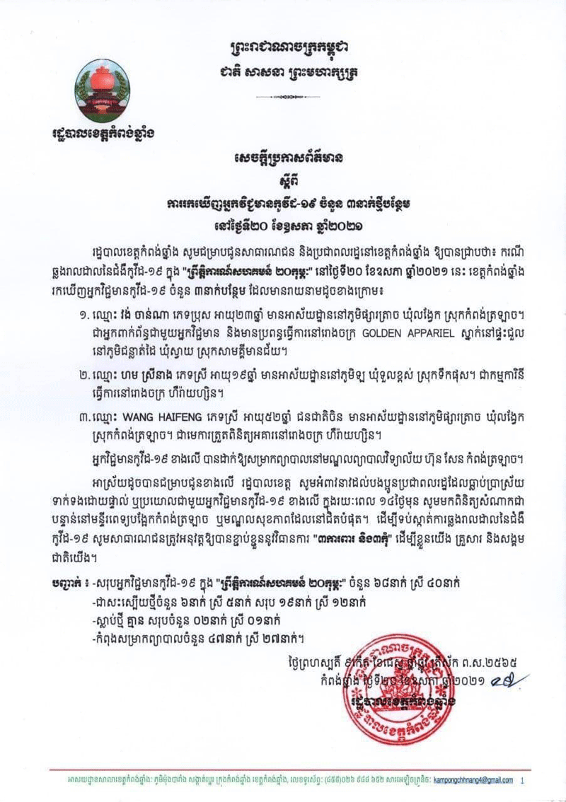 ខេត្តកំពង់ឆ្នាំងះ រដ្ឋបាលខេត្តកំពង់ ឆ្នាំងនៅល្ងាចថ្ងៃទី២០ ខែឧសភា២០២១ម្សិលមិញបានចេញ សេចក្តីប្រកាសព័ត៌មានបញ្ជាក់ឲ្យដឹងថា បានរកឃើញអ្នកមា នវិជ្ជមានថ្មីកូវិដ១៩ ចំនួន ៣ នាក់បន្ថែមទៀ តគឺ ១ . ឈ្មោះ វង់ ចាន់ណា ភេទ ប្រុសអាយុ ២៣ ឆ្នាំ មានអាស័យដ្ឋាននៅ ភូមិផ្សារត្រាច ឃុំលង្វែក ស្រុកកំពង់ត្រឡាច ពាក់ព័ន្ធជាមួយអ្នក មានវិជ្ជមាន និងមានប្រពន្ធធ្វើ ការនៅក្នុងរោងចក្រ GOLDEN APPA RIEL ស្នាក់នៅផ្ទះជួលក្នុងភូមិជន្លាត់ដៃឃុំស្វាយស្រុក សាមគ្គីមានជ័យ ។