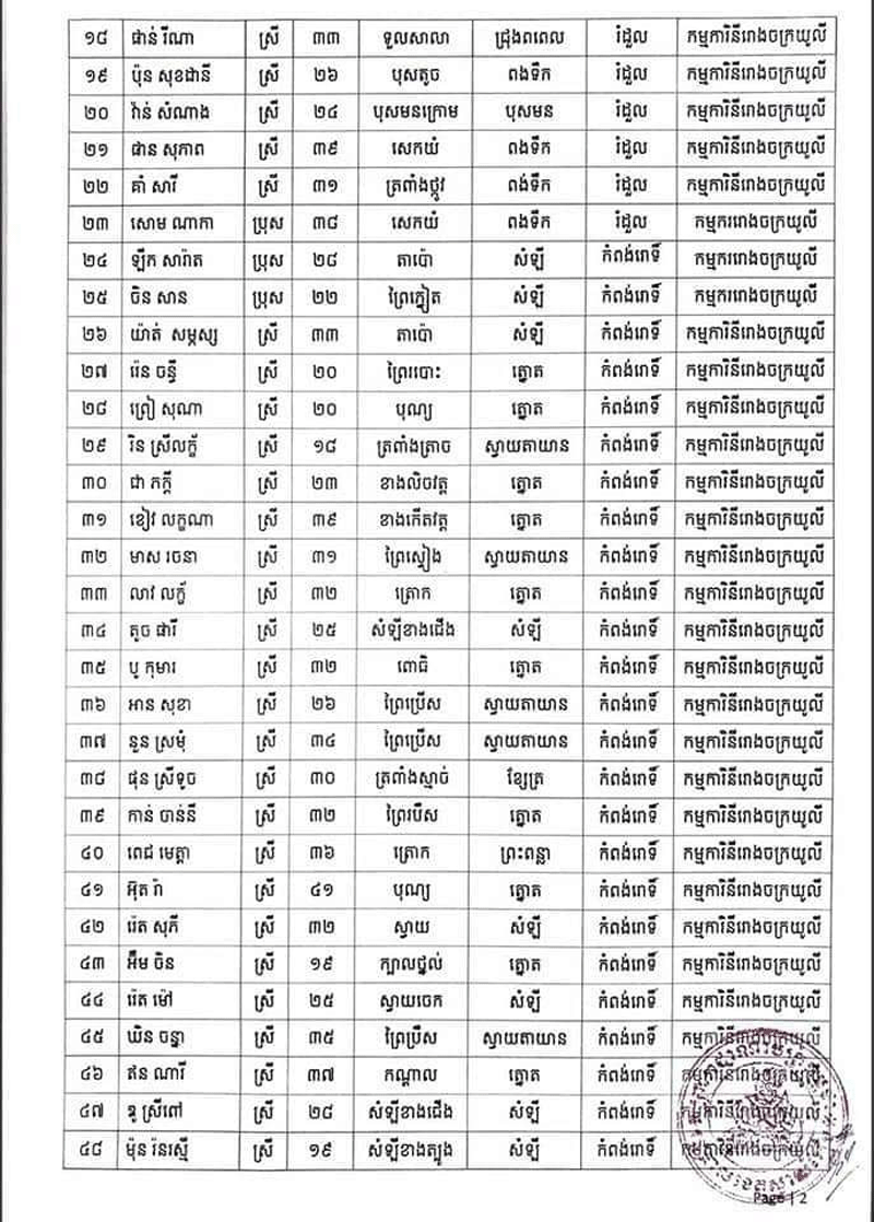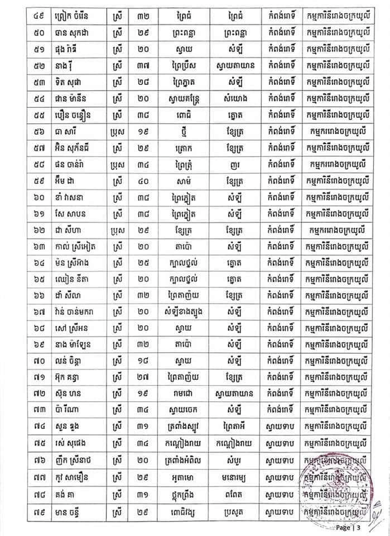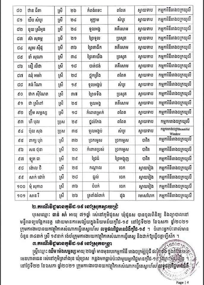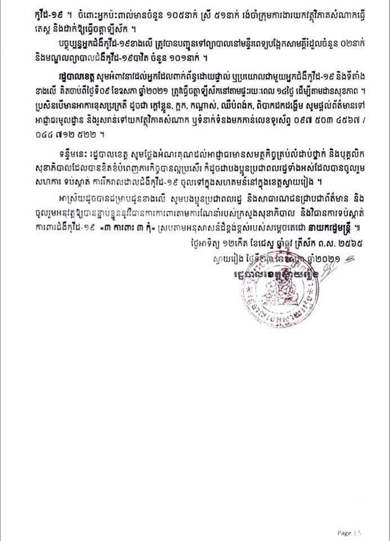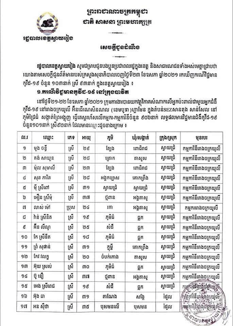 រដ្ឋបាលខេត្តស្វាយរៀងបានចេញសេចក្តីប្រកាសព័ត៌មាននិងអំពាវនាវដល់អ្នកពាក់ព័ន្ធជាមួយកម្មករកម្មការិនីរោងចក្រ ដែលឈ្មោះក្នុងសេចក្តីប្រកាសព័ត៌មានត្រូវប្រញាប់រួសរាន់មកធ្វើតេស្តរកជំងឺកូវីដ-១៩ ឱ្យបានទាន់ពេលវេលា និងរួមគ្នាអនុវត្តវិធានការ របស់ក្រសួងសុខាភិបាលឱ្យបានខ្ជាប់ ខ្ជួនជាពិសេសអនុវត្តតាមអនុសាសន៍របស់សម្ដេចតេជោ ហ៊ុន សែន នូវវិធានការ «៣ការពារ និង៣កុំ» បើមិនចាំបាច់សូមកុំចេញក្រៅផ្ទះហើយបើសង្ស័យមានរោគសញ្ញាខុសពីប្រក្រតីដូចជា ក្តៅខ្លួន ក្អក កណ្តាស់ ឈឺបំពង់ក ពិបាកដកដង្ហើម សូមផ្តល់ព័ត៌មានទៅអាជ្ញាធរមូលដ្ឋានឬទាក់ ទងទៅ លេខទូរស័ព្ទ ០៩៧ ៥០៣៥៤៦៧ ឬ ០៤៤៧១២៥២២៕