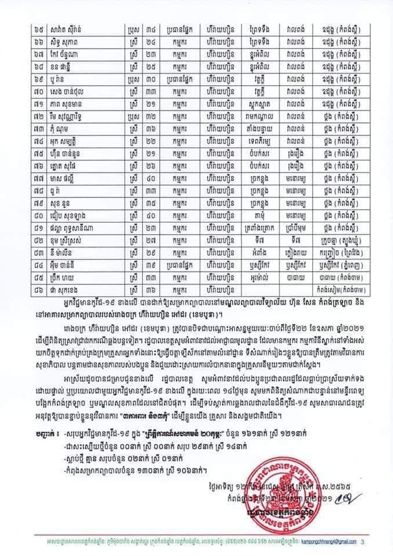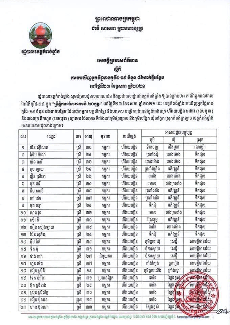ខេត្តកំពង់ឆ្នាំង៖ នៅរសៀលថ្ងៃទី២៣ ខែឧសភា ឆ្នាំ២០២១នេះ រដ្ឋបាល ខេត្តកំពង់ឆ្នាំង បានចេញសេចក្ដី ប្រកាសព័ត៌មាន ស្ដីពីការរកឃើញករណីវិជ្ជមានកូវីដ-១៩ ចំនួន ៨៦ នាក់ថ្មីបន្ថែមទៀត ដែលជាកម្មករ បុគ្គលិកខ្មែរ និងបរទេស បម្រើការងារនៅរោងចក្រ ហឹរ៉ាយហ្សិន អៅដរ (ខេមបូឌា) និងរោងចក្រ តឹកហ្វុក (ខេមបូឌា) ហ្គាមេន ដែលមានទីតាំងនៅក្នុងភូមិផ្សារត្រាច និងភូមិលង្វែក ឃុំលង្វែក ស្រុកកំពង់ត្រ ឡាច ខេត្តកំពង់ឆ្នាំង។ ដោយឡែកនៅក្នុងសេចក្តីប្រកាសព័ត៌មាននេះរដ្ឋបាលខេត្តបានឲ្យដឹងថាគិតមកដល់ថ្ងៃនេះ ខេត្តកំពង់ ឆ្នាំងមានអ្នកមានវិជ្ជមានកូវីដ១៩ សរុបចំនួន១៦១នាក់ ស្រី១២១ នាក់ , អ្នកជាសះស្បើយសរុបចំនួន២៩ ស្រី១៤នាក់ , អ្នកស្លាប់សរុបចំនួន២នាក់ ស្រី២នាក់ , និងកំពុងសម្រាកព្យាបាលសរុបចំនួន១៣០ នាក់ ស្រី១០១នាក់ ។