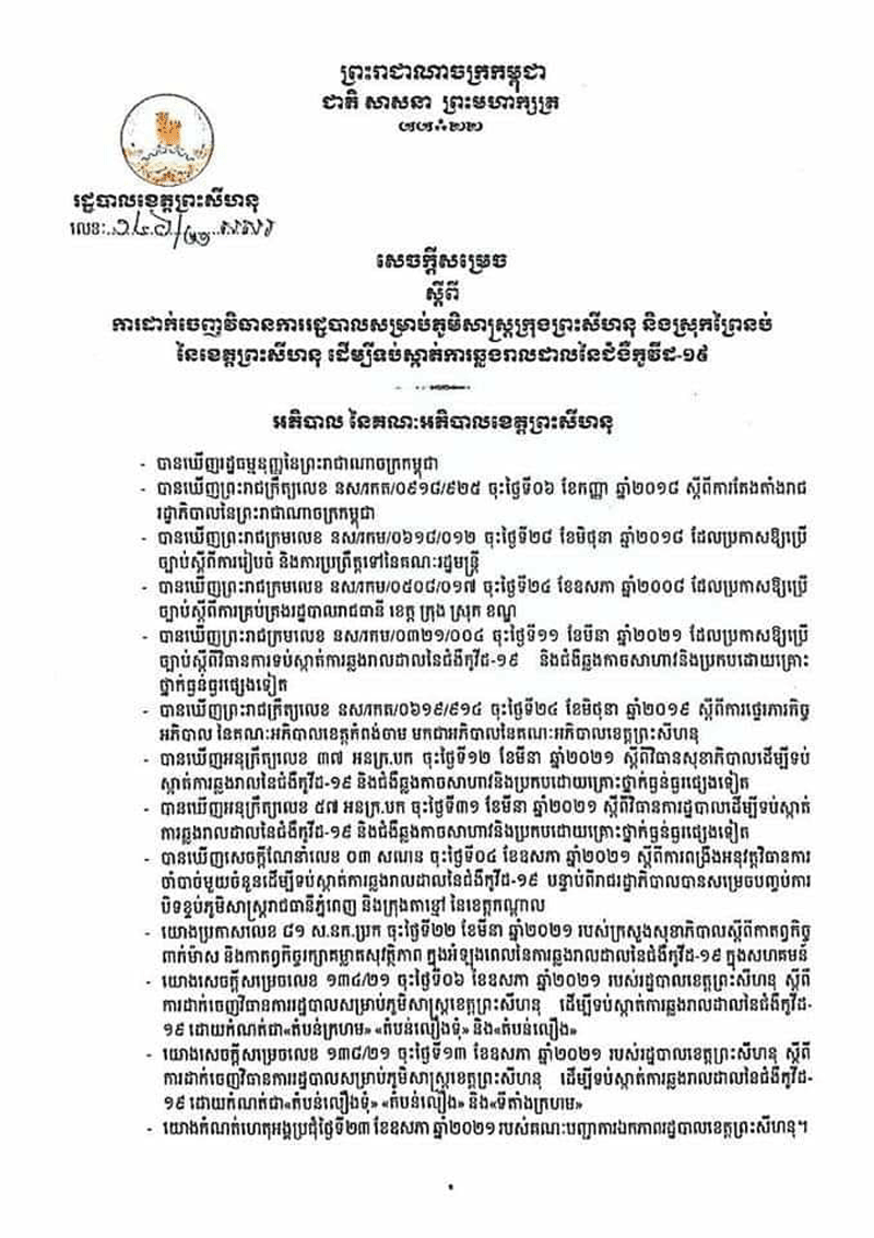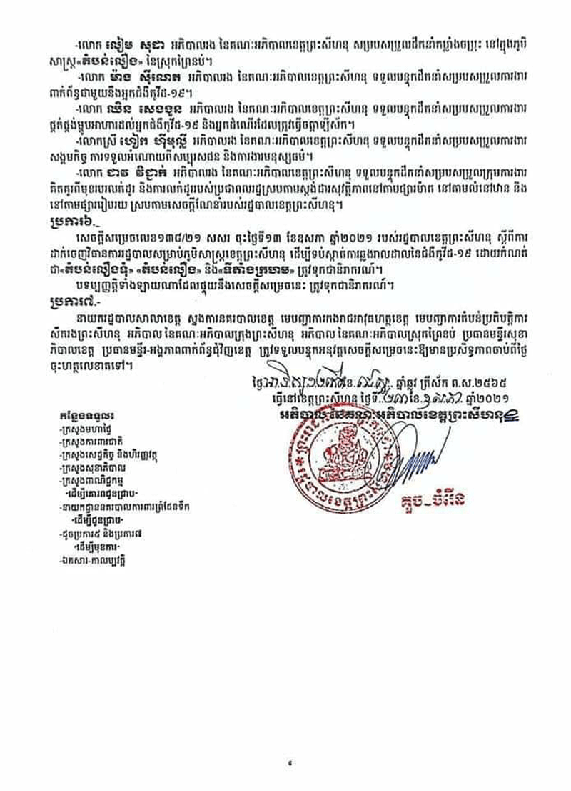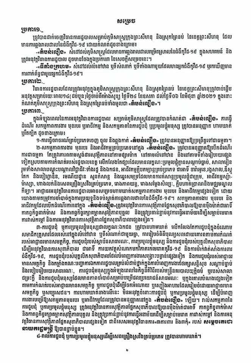 ព្រះសីហនុៈតំបន់ស្រុកព្រៃនប់ខេត្តព្រះសីហនុដែលទើបមានការឆ្លងរាលដាលថ្មីនិងត្រូវបានពង្រីកជាតំបន់លឿងនិងជាទីតាំងក្រហមព្រមទាំងបង្កើនវិធានការផាកពិន័យទៅតាមការល្មើសបំរាមទាំងឡាយដែលបានដាក់ចេញ សំដៅកាត់ផ្តាច់ការឆ្លងរីករាលដាលជំងឺកូវិដ-១៩ នៅក្នុងសហគមន៍។ រដ្ឋបាលខេត្តព្រះសីហនុ បានចេញសេចក្ដីសម្រេច ការផ្អាកអាជីវកម្មតំបន់ប្រជុំជនផ្សារមួយ ចំនួនក្នុងស្រុកជាពិសេសផ្សារវាលរេញដែលជាប្រជុំជនផ្សារធំមួយក្នុងស្រុកព្រៃនប់ និងឈានដល់ ការបិតផ្អាកអាជីវកម្មលក់ដូរជាបណ្តោះអាសន្នសិន រហូតមានការធូស្បើយនៃការឆ្លងរាលដាលជំកូវិដ-១៩ ក្នុងសហគមន៍នេះ ៕