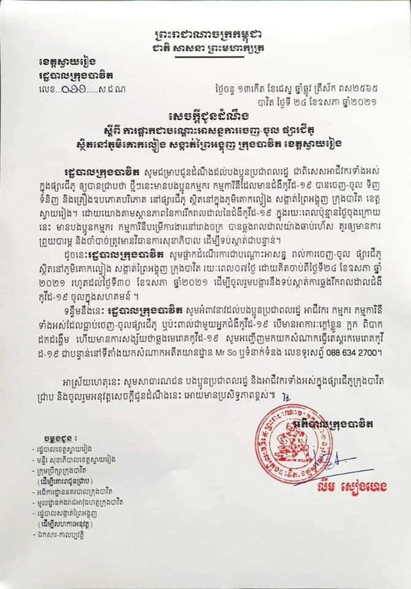 ខេត្តស្វាយរៀង៖យោងតាមសេចក្ដីជួនដំណឹងរបស់រដ្ឋាភិបាលក្រុងបាវិតខេត្តស្វាយរៀងសូមអំពាវនាវដល់បងប្អូនប្រជាពលរដ្ឋ អាជីវករ កម្មករ កម្មការិនី ដែលធ្លាប់លក់ដូរ និងទៅទិញឥវ៉ាន់នៅក្នុងផ្សារជីភូ ភូមិគោកល្វៀង សង្កាត់ព្រៃអង្គុញ ក្រុងបាវិតនិងនៅក្នុងផ្សារ ថូម៉ាក ភូមិកំពោតជ្រូក សង្កាត់ព្រៃអង្គុញ ក្រុងបាវិត ដែលកន្លងមកមានអ្នកវិជ្ជមានកូវីដ-១៩ និងអ្នកប៉ះពាល់ជាមួយអ្នកវិជ្ជមានបានមកទិញឥវ៉ាន់នៅផ្សារខាងលើ។