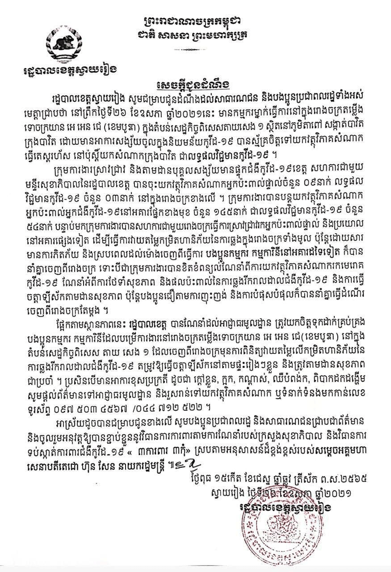 សេចក្តីជូនដំណឹង របស់រដ្ឋបាលខេត្តស្វាយរៀងជុំវិញករណីដែលកើតឡើង នៅតំបន់សេដ្ឋកិច្ចពិសេសតាយសេង១កាលពីថ្ងៃទី២៦ ខែឧសភា ឆ្នាំ២០២១នេះដូចខាងក្រោមនេះ admin — 27/05/2021 in ព័ត៌មានជាតិ 44 Likes 205 Views Share Tweet on Twitter Share on Facebook Google+ Pinterest