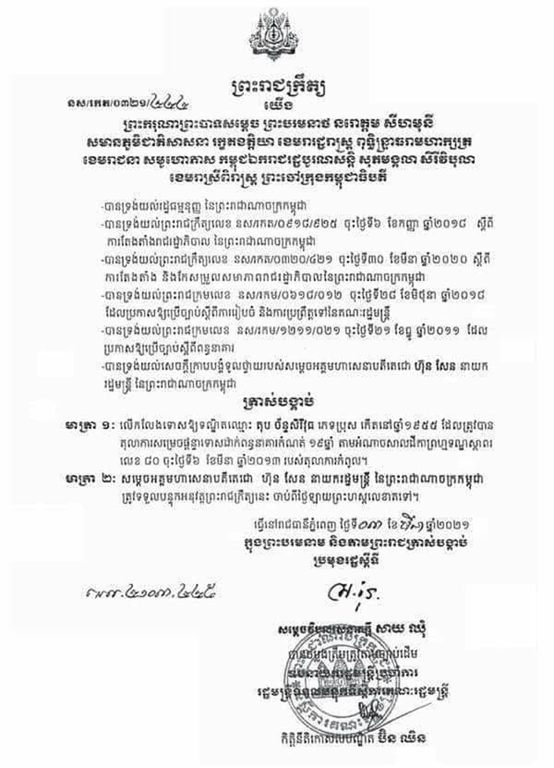 ភ្នំពេញៈ នេះបើយោងតាមរាជក្រឹត្យ ចុះថ្ងៃទី០៣ ខែមីនា ឆ្នាំ២០២១ ដែលទើបតែបាននៅថ្ងៃទី២៨ ខែឧសភា ឆ្នាំ២០២១។ បន្ទាប់ពីជាប់ពន្ធនាគារអស់រយៈពេល ១១ឆ្នាំ ពាក់ព័ន្ធរឿងប្រព្រឹត្ត អំពើពុករលួយលោក តុប ច័ន្ទសិរីវុធ អតីតព្រះរាជអាជ្ញានៃអយ្យការអមសាលា ដំបូខេត្តពោធិ៍សាត់ ត្រូវបានលើកលែង ទោសឲ្យមានសេរីភាព។