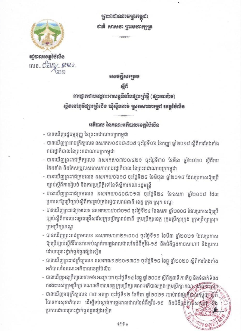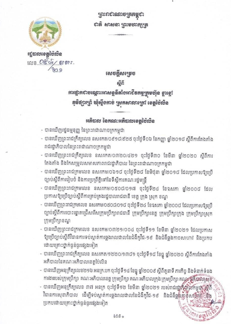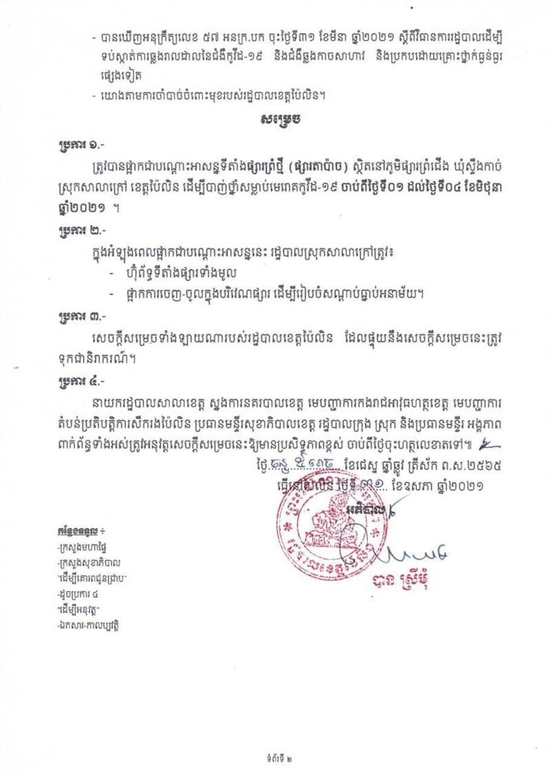 ដូច្នេះ នាយករដ្ឋបាលខេត្ត ស្នងការនគរបាលខេត្ត មេបញ្ជាការកងរាជអាវុធហត្ថខេត្ត មេបញ្ជាការតំបន់ប្រតិបត្តិការសឹករងប៉ៃលិន ប្រធានមន្ទីរសុខាភិបាលខេត្ត រដ្ឋបាលក្រុង ស្រុក និងប្រធាន មន្ទីរអង្គភាព ពាក់ព័ន្ធទាំងអស់ត្រូវអនុវត្តសេចក្តីសម្រេចនេះ ឱ្យមានប្រសិទ្ធភាពខ្ពស់ ចាប់ពីថ្ងៃអភិបាល ខេត្តប៉ៃលិន ចុះហត្ថលេខាតទៅ ៕ ដោយ ៖ នីយ៉ា
