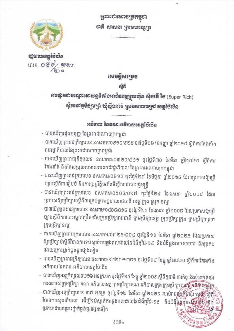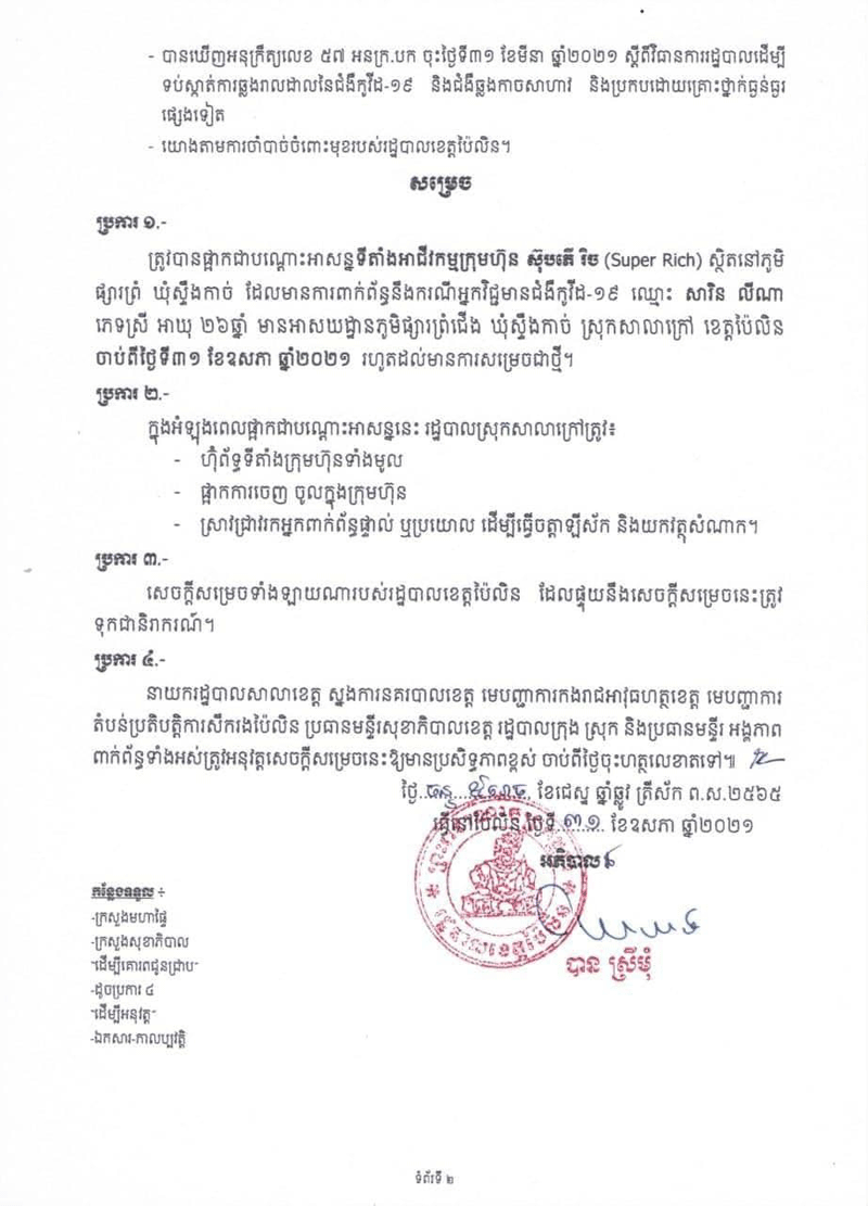 ខេត្តប៉ៃលិន ៖ អភិបាលខេត្តប៉ៃលិន លោកជំទាវ បាន ស្រីមុំ បានសម្រេចបិទផ្អាកបណ្តោះអាស ន្នទីតាំងអាជីវកម្ម ក្រុមហ៊ុន ស៊ុបភើ រិច (Super Rich), ក្រុមហ៊ុន ខ្លាខ្មៅ និងផ្សារព្រំថ្មី (ផ្សារតាប៉ាច) ជាប់ពាក់ព័ន្ធនឹងករណីអ្នកជំងឺកូវីដ-១៩ ដែលការបិទផ្អាកនេះ បានធ្វើឡើងនៅថ្ងៃទី៣១ ខែឧសភា ឆ្នាំ២០២១ ស្ថិតនៅក្នុងភូមិផ្សារព្រំ ឃុំស្ទឹងកាច់ ស្រុកសាលាក្រៅ ខេត្តប៉ៃលិន ។