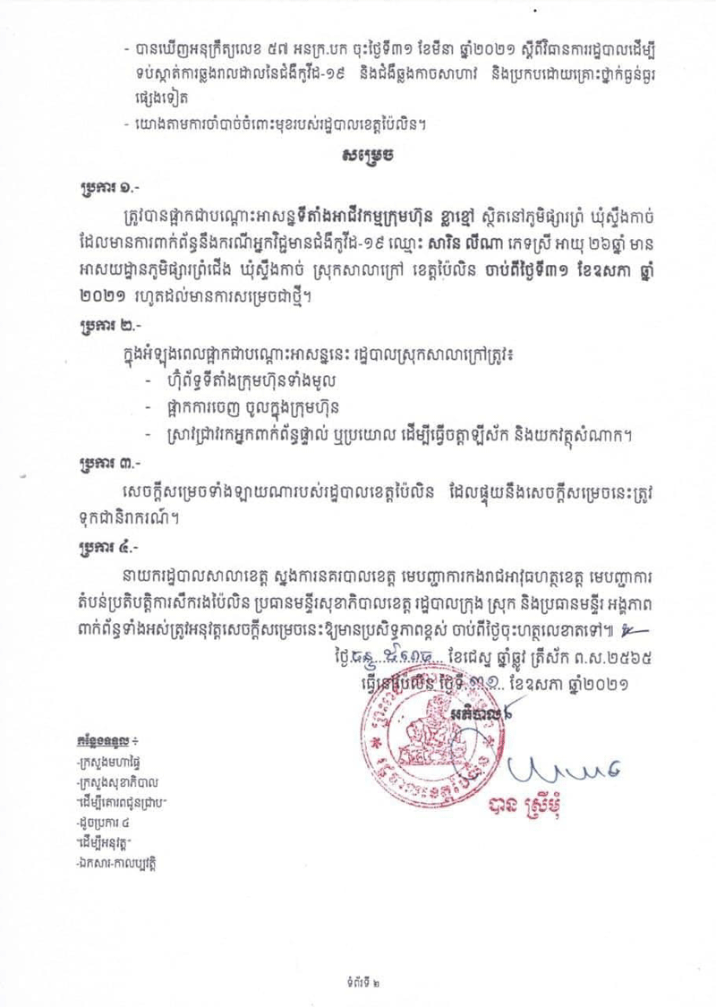 ប្រភពព័ត៌មាននៅក្នុងលិខិតរបស់រដ្ឋបាលខេត្តប៉ៃលិន លេខ ០៥៨/២១ សសរ. ស្តីពីការផ្អាកប ណ្តោះអាសន្ន ទីតាំងអាជីវកម្ម ក្រុមហ៊ុនទាំងពីរខាងលើ និងផ្សារព្រំថ្មី (ផ្សារតាប៉ាច) ដែលមានជាប់ពាក់ព័ន្ធនឹងករណីអ្នកវិជ្ជមានជំងឺកូវីដ-១៩ ម្នាក់ មាន ឈ្មោះ សារិន លីណា ភេទស្រី អាយុ២៦ឆ្នាំ ដែលមា នអាសយដ្ឋានរស់នៅភូមិផ្សារព្រំជើង ឃុំស្ទឹងកាច់ ស្រុកសាលាក្រៅ ខេត្តប៉ៃលិន ចាប់ផ្អាកពីថ្ងៃទី៣១ ខែឧសភា ឆ្នាំ២០២១ រហូតដល់មានការសម្រេចជាថ្មី ។ ប្រភពបន្តទៀតថា ក្នុងកំឡុងពេលផ្អាកបណ្តោះអាសន្ននេះ រដ្ឋបាលស្រុកសាលាក្រៅ ត្រូវហ៊ុព័ទ្ធជុំវិញក្រុមហ៊ុនទាំងមូល ផ្អាកការចេញ ចូលក្នុងក្រុមហ៊ុន ត្រូវស្រាវជ្រាវ រកអ្នកពាក់ព័ន្ធផ្ទាល់ ឬប្រយោល ដើម្បីយកមកធ្វើចត្តាឡីស័ក និងយកវត្ថុសំ ណាក ។ ប្រភពដដែលបញ្ជាក់ថា ការផ្អាកបណ្តោះអាសន្នទីតាំងផ្សារព្រំថ្មី (ផ្សារតាប៉ាច) ដោយហ៊ុព័ទ្ធទីតាំងផ្សារទាំងមូល ផ្អាកការចេញចូលក្នុងបរិវេណផ្សារ ដើម្បីរៀបចំសណ្តាប់ធ្នាប់អនាម័យ ។