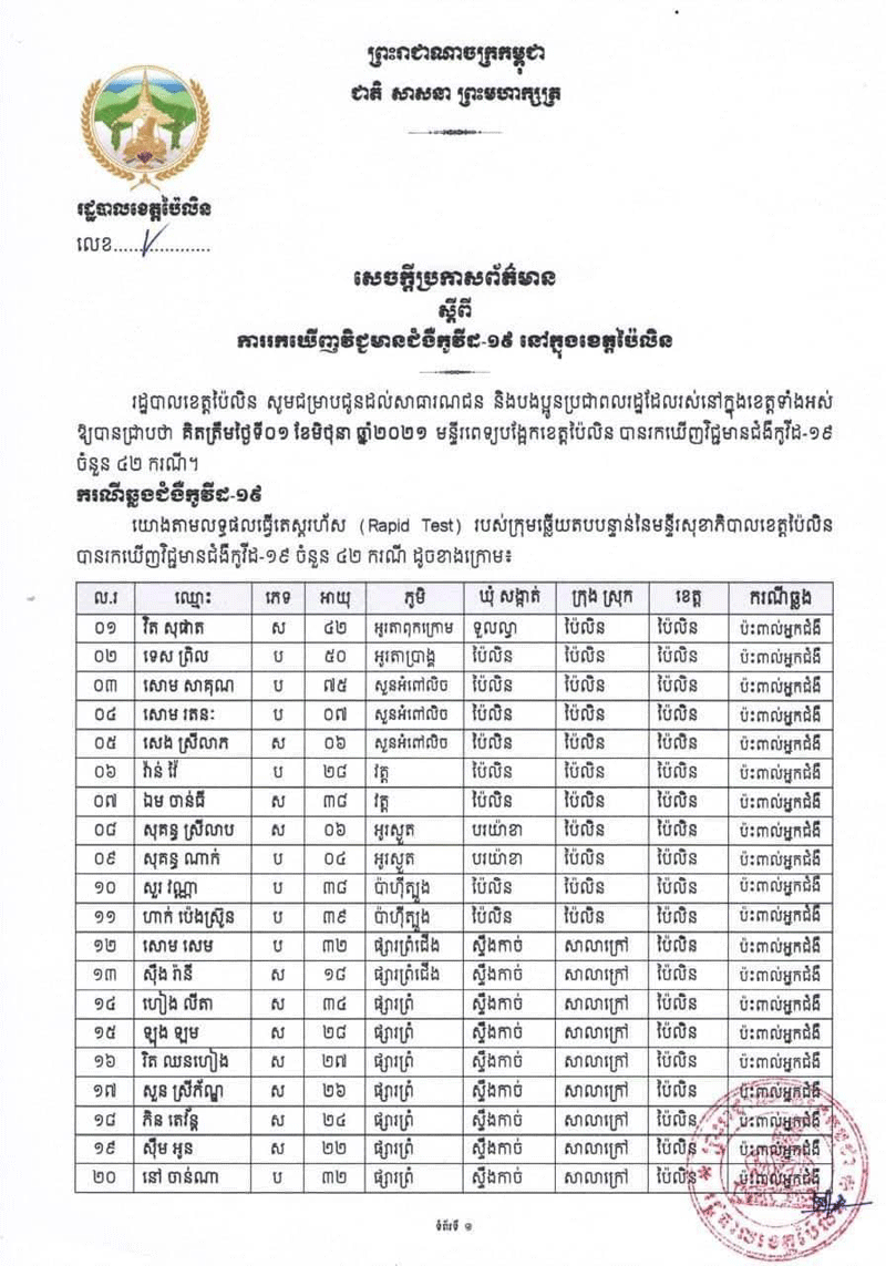 ខេត្តប៉ៃលិន ៖ គិតត្រឹមថ្ងៃទី០១ ខែមិថុនា ឆ្នាំ២០២១ ក្រោយពីធ្វើតេស្តរហ័សទៅលើប្រជាពលរដ្ឋចំនួន៤២នាក់ ដែលភាគច្រើន គឺជាអ្នកចូលលេងក្នុងកាស៊ីណូ នៅជាប់ច្រកទ្វារអន្តរជាតិព្រំ ស្ថិតក្នុងភូមិផ្សារព្រំ ឃុំស្ទឹងកាច់ ស្រុកសាលាក្រៅ ខេត្តប៉ៃលិន ហើយត្រូវបានក្រុមគ្រូពេទ្យបង្អែកខេត្តប៉ៃលិន រកឃើញវិជ្ជមានទាំងអស់ ។ ដូច្នេះ គេមានការព្រួយបារម្ភខ្លាំង ខណ:ពួកគាត់ទាំងអស់ នោះគឺរស់នៅតាមភូមិនានាស្ទើរតែទូទាំងខេត្តប៉ៃលិន ។