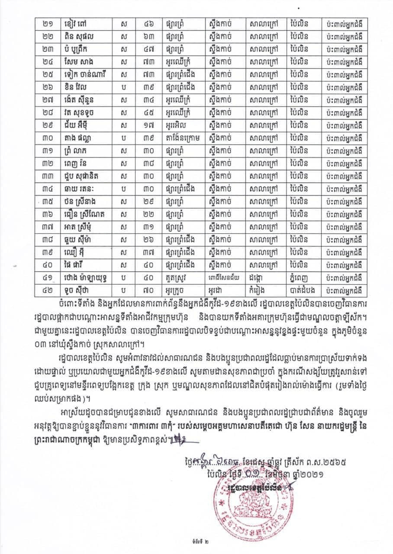 ប្រភពបញ្ជាក់ថា អ្នកដែលឆ្លងជំងឺកូវីដ-១៩ មកពីតាមបណ្តាភូមិនានាក្នុងខេត្តប៉ៃលិន និង អ្នករស់នៅក្រៅខេត្តផងដែរ ដែលអ្នកឆ្លងទាំងនោះមកពី ៖ ភូមិអូរតាពុកក្រោម០១នាក់ ភូមិអូរតាប្រាង០១នាក់ ភូមិសួនអំពៅលិច០៣នាក់ ភូមិតាង៉ែនក្រោម០១នាក់ ភូមិវត្ត០២នាក់ ភូមិអូរស្ងួត០២នាក់ ភូមិប៉ាហ៊ីត្បូង០២នាក់ ភូមិផ្សារព្រំជើង០៨នាក់ ភូមិផ្សារព្រំ១៦នាក់ ភូមិអូរឈើក្រំ០៣នាក់ ភូមិអូររអិល០១នាក់ ភូមិអូរក្រូច ឃុំអូរដា ស្រុកកំរៀង ខេត្តបាត់ដំបង០១នាក់ និងភូមិគួតស្រូវ សង្កាត់ពោធិ៍សែនជ័យ ខណ្ឌដង្កោ រាជធានីភ្នំពេញ០១នាក់ ។