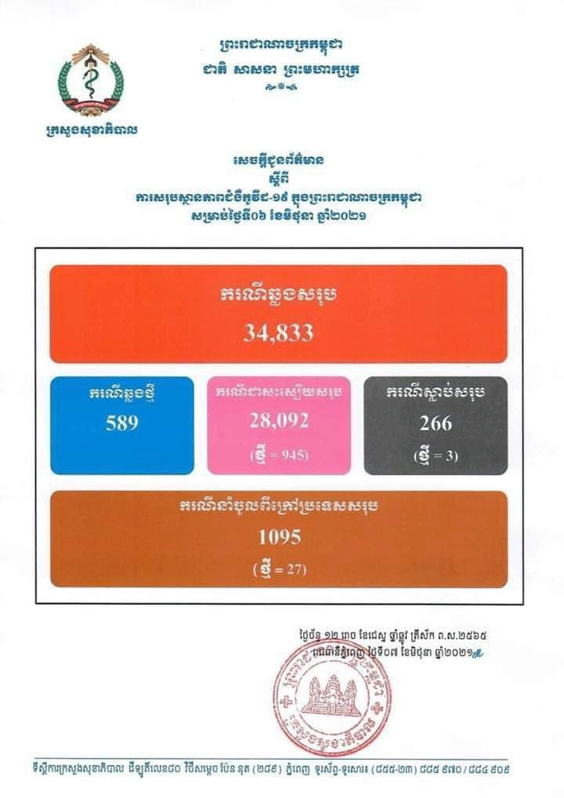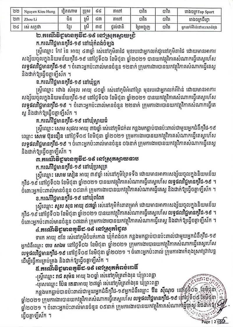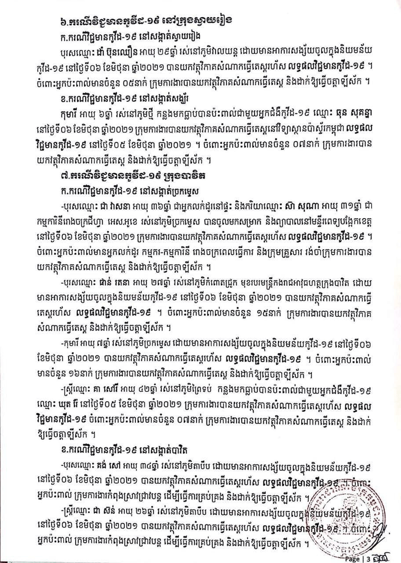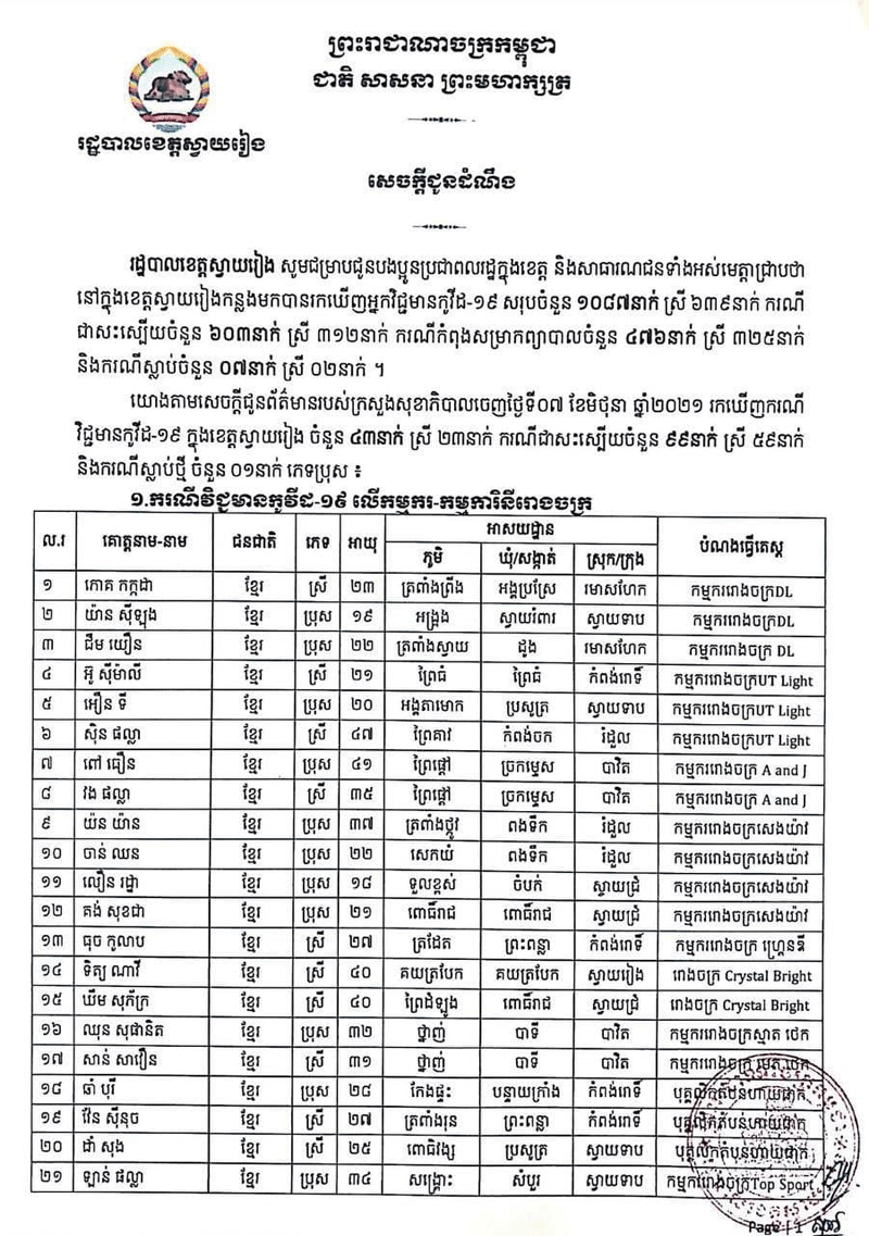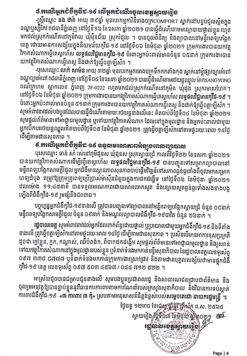 គួររំលឹកផងដែរបុរសដែលស្លាប់ឈ្មោះ ឆាន់ សាំ រស់នៅភូមិ ដូនស ឃុំ ដូនស ស្រុក ស្វាយជ្រំ ខេត្តស្វាយរៀងកាលពីថ្ងៃទី២២ខែឧសភាឆ្នាំ២០២១បានយកវត្ថុវិភាគសំណាកដើម្បីធ្វើតេស្តរហ័សលទ្ធផលវិជ្ជមានកូវីដ-១៩ក៏បានបញ្ជូនទៅសម្រាកព្យាបាលនៅមន្ទីរពេទ្យបង្អែក សាមគ្គីរំដួល ស្រុករំដួលខេត្តស្វាយរៀងហើយដោយអ្នកជំងឺមានស្ថានភាពសុខចាប់ផ្តើមវិវត្តន៍ទៅសភាពធ្ងន់ធ្ងរតាំងពីចូលមកសម្រាកនៅមន្ទីរពេទ្យដំបូងតម្រូវឲ្យក្រុមគ្រូពេទ្យប្រើប្រាស់នូវម៉ាសុីនជំនួយក្នុងការដកដង្ហើមហើយនៅថ្ងៃទី៦ខែមិថុនាឆ្នាំ២០២១វេលាម៉ោង១១ៈ៤៥នាទីបានទទួលមរណភាពដោយសាររលាកសួតនិងខ្សោយសួតធ្ងន់ធ្ងរទាំងសងខាងបង្កឡើងដោយជំងឺកូវីដ-១៩រួមផ្សំជរាពាធផង។ ចំពោះករណីអ្នកស្លាប់ដោយសារជំងឺកូវីដ-១៩ខាងលើនេះជាករណីទី៧ហើយក្នុងខេត្តស្វាយរៀង។ យោងតាសេចក្តីជួនដំណឹងរបស់រដ្ឋបាលខេត្តស្វាយរៀងសូមជម្រាបផងដែរថានៅក្នុងខេត្តស្វាយរៀងកន្លងមករកឃើញអ្នកវិជ្ជមានកូវីដ-១៩សរុបចំនួន១០៨៧នាក់ស្រីចំនួន៦៣៩នាក់ករណីជា សះស្បើយចំនួន៦០៣នាក់ស្រី៣១២នាក់ករណីកំពុងសម្រាកព្យាបាលចំនួន៤៧៦នាក់ស្រី៣២៥នាក់និងករណីស្លាប់ចំនួន៧នាក់នេះបើយោងតាមសេចក្ដីជួនព័ត៌មានរបស់ក្រសួងសុខាភិបាលចេញថ្ងៃទី៧ខែមិថុនាឆ្នាំ២០២១រកឃើញករណីវិជ្ជមាន-១៩ក្នុងខេត្តស្វាយរៀងចំនួន៤៣នាក់ស្រី២៣នាក់ករណីជា សះស្បើយចំនួន៩៩នាក់ស្រី៥៩នាក់និងករណីស្លាប់ម្នាក់ភេទប្រុស៕ ក្នុងនោះដែរ រដ្ឋបាលខេត្តស្វាយរៀង៖ សូមអំពាវនាវដល់អ្នក ដែលបានប្រាស្រ័យទាក់ទង ប៉ះពាល់ដោយផ្ទាល់ឬប្រយោល ជាមួយបុគ្គលវិជ្ជមានកូវីដ១៩ ទាំង៤៣នាក់ខាងលើសូមដាក់ខ្លួនដាច់ដោយឡែកតាមដានសុខភាព រយៈពេល១៤ថ្ងៃ ហើយប្រសិនមានអាការខុសប្រក្រតី ដូចជា ក្តៅខ្លួន ក្អក កណ្តាស់ ឈឺបំពង់ក ពិបាកដកដង្ហើម សូមផ្តល់ព័ត៌មានទៅអាជ្ញាធរមូលដ្ឋាននិងរួសរាន់ទៅយកវត្ថុវិភាគសំណាកឬទាក់ទងមកកាន់លេខទូរស័ព្ទ ០៩៧ ៥០៣ ៤៥៦៧/០៤៤៧១២៥២២និងសូមឲ្យបងប្អូន ប្រជាពលរដ្ឋចូលរួមអនុវត្តឲ្យខ្ចាប់ ខ្ជួននូវវិធាការការពារតាមណែនាំរបស់ក្រសួងសុខាភិបាលនិងវិធានការទប់ស្តាត់ការពារជំងឺកូវីដ-១៩«៣ ការពារ ៣ កុំ»ស្របតាមអនុសាសន៍ដ៏ខ្ពង់ខ្ពស់របស់សម្តេចតេជោ ហ៊ុន សែន នាយករដ្ឋមន្ត្រី៕