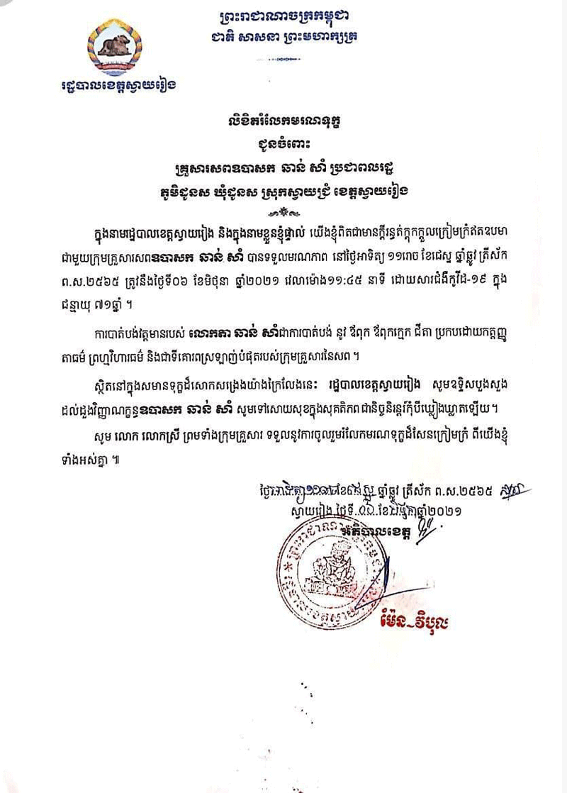 ខេត្តស្វាយរៀង៖រដ្ឋបាលខេត្តស្វាយរៀងពិតជាមានក្តីរន្ធត់ក្តុកក្តួលក្រៀមក្រំឥតឧបមាជាមួយគ្រួសារសពឧបាសក ឆាន់ សាំ ចំពោះការបាត់បង់សាច់ញាតិជាទីគោរពស្រឡាញ់ និងសូមបួងសួងដួងវិញ្ញាណ ក្ខន្ធឧបាសក ឆាន់ សាំ ឆាប់បានចាប់បដិសន្ធិក្នុងសុគតិភពកុំបីឃ្លៀងឃ្លាតឡើយ។