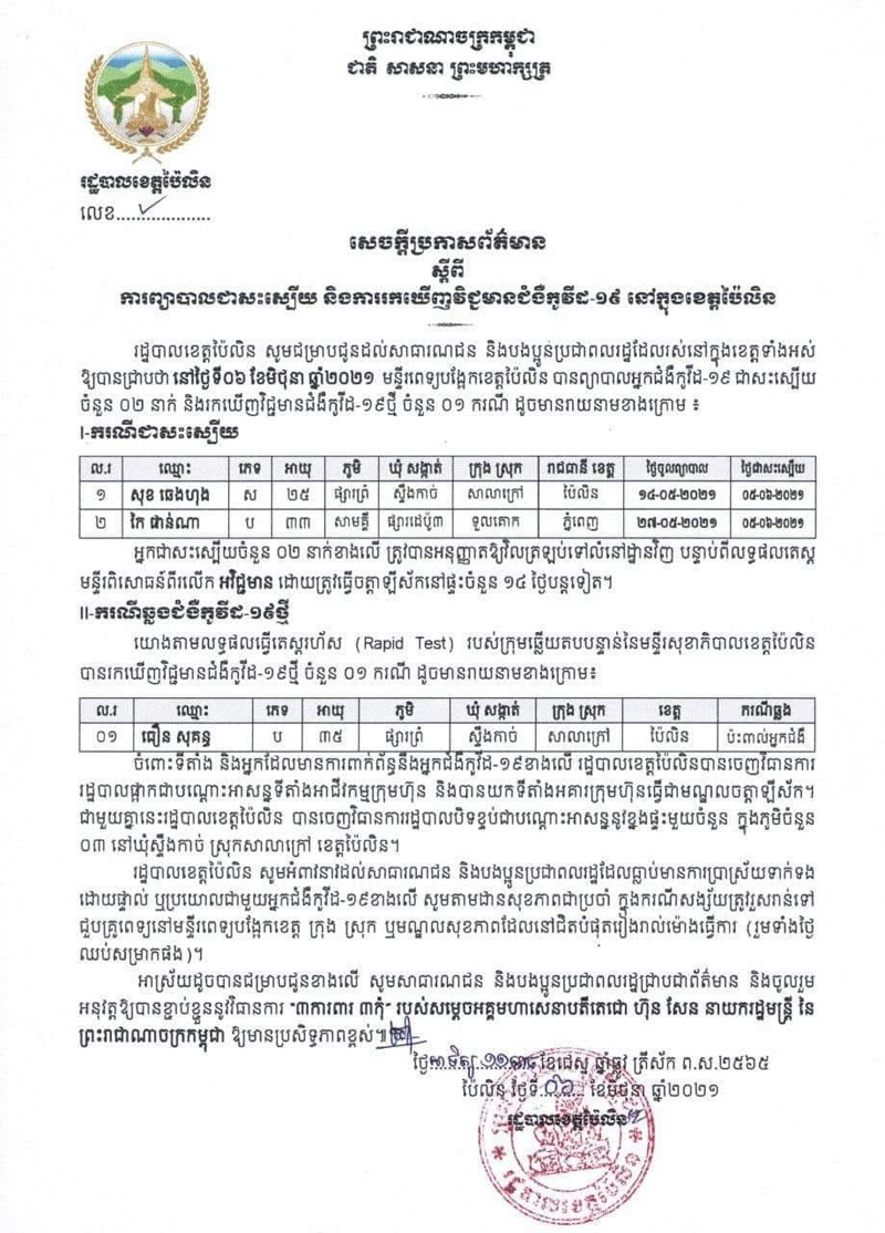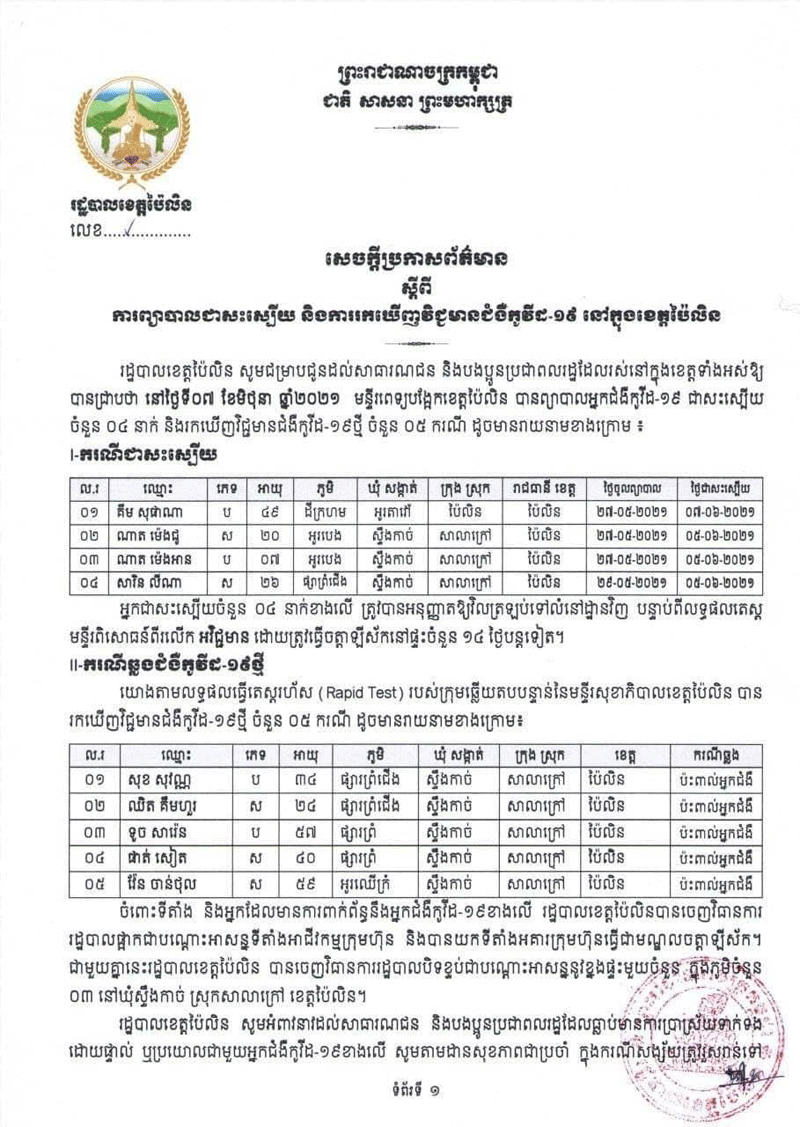 ខេត្តប៉ៃលិន ៖ រហូតមកដល់ថ្ងៃទី៧ ខែមិថុនា ឆ្នាំ២០២១នេះ អាជ្ញាធរខេត្តប៉ៃលិន ដែលដឹកនាំដោយលោកជំទាវ បាន ស្រីមុំ អភិបាលខេត្តប៉ៃលិន, ឯកឧត្តម សៅ សារ៉ាត់ អ្នកតំណាងរាស្ត្រមណ្ឌលប៉ៃលិន បានដឹកនាំមន្ត្រីរាជការ អង្គភាពជុំវិញខេត្ត ធ្វើការសម្អាតអនាម័យ និងលាបថ្នាំអាគារមួយកន្លែងទៀត ដើម្បីត្រៀមធ្វើជាមណ្ឌលសម្រាប់ចត្តាឡីស័កបន្ថែមទៀត នៅក្នុងបរិវេណអតីតវិទ្យាល័យ ហ៊ុន សែន សាលាក្រៅ ស្ថិតក្នុងភូមិអូរអណ្តូង ឃុំអូរអណ្តូង ស្រុកសាលាក្រៅ ខេត្តប៉ៃលិន ។