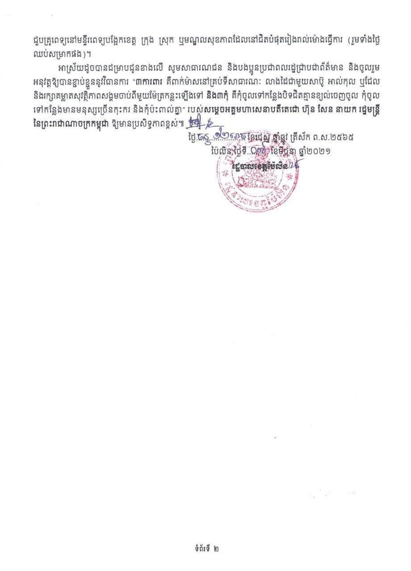 នៅក្នុងឱកាសនោះដែរ លោកជំទាវ បាន ស្រីមុំ ក៍បានថ្លែងការកោតសរសើ និងថ្លែងអំណរគុណយ៉ាងជ្រាលជ្រៅ ចំពោះកងម្លាំងសមត្ថកិច្ច និងក្រុមគ្រូពេទ្យជំនាញ ព្រមទាំងមន្ត្រីរាជការទាំងអស់គ្រប់ជាន់ថ្នាក់ ដែលកំពុងបំពេញបេសកកម្មដ៏ថ្លៃថ្លា សម្រាប់ប្រជាជន និងប្រទេសជាតិ នៅតាមគោលដៅ និងតាមមណ្ឌលចត្តាឡីស័កនានាក្នុងខេត្ត ប្រកបដោយការទទួលខុសត្រូវខ្ពស់ ដើម្បីរួមគ្នាប្រយុទ្ធប្រឆាំង និងទប់ស្កាត់ការចម្លងរីករាលដាលជំងឺកូវីដ-១៩ ៕ ដោយ ៖ នីយ៉ា