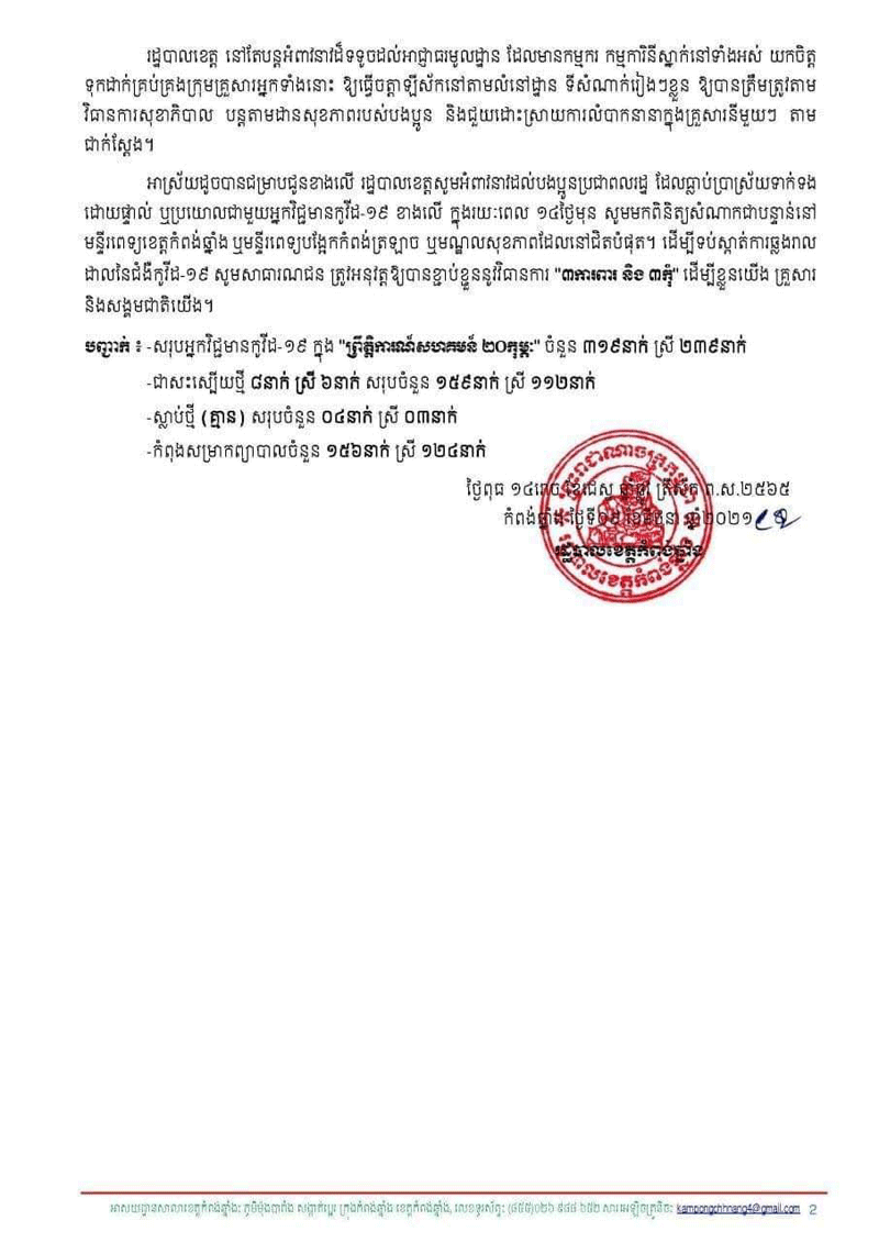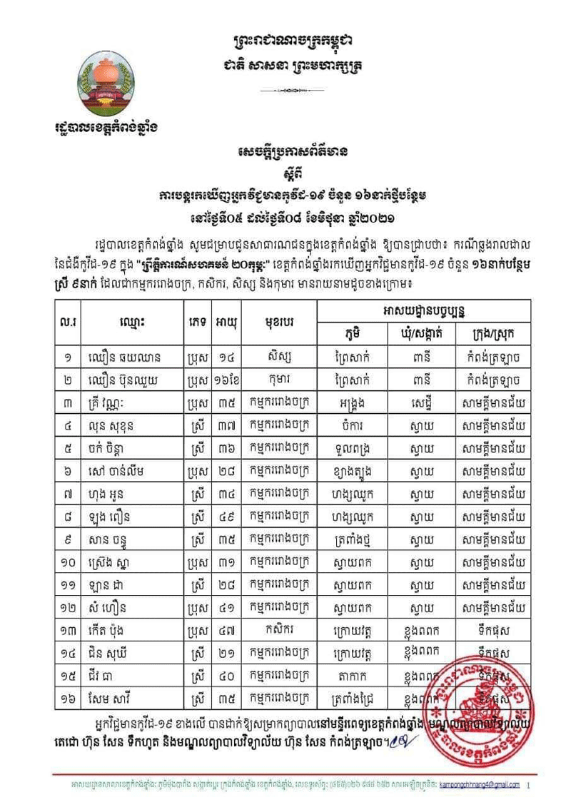 ខេត្តកំពង់ឆ្នាំង:រដ្ឋបាលខេត្តកំពង់ឆ្នាំងសូមជម្រាបជូនសាធារណៈជនក្នុងខេត្តកំពង់ឆ្នាំងបានជាថាឆ្លងរីករាលដាល នាក់ដែលជាកម្មកររោងចក្រកសិករសិស្សនៅកុមារផងដែរ ។