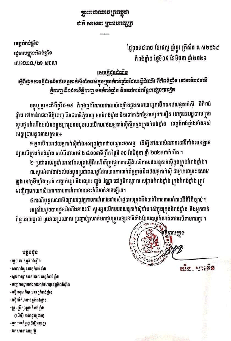 ខេត្តកំពង់ឆ្នាំង:បើយោងតាមសេចក្តីជូនដំណឹងរបស់សាលាក្រុងកំពង់ឆ្នាំងនៅថ្ងៃទី១០មិថុនា២០២១នេះស្តីពីការផ្អាកការធ្វើដំណើរតាមរថយន្តតាក់ស៊ីទាំងអស់ក្នុងក្រុងកំពង់ឆ្នាំងដែលធ្វើដំណើរពីកំពង់ឆ្នាំងទៅកាន់រាជធានីភ្នំពេញ ។ បច្ចុប្បន្ននេះជម្ងឺកូវិដ១៩កំពុងឆ្លងរីករាលដាលយ៉ាងខ្លាំងឆ្លង តាមរយៈ អ្នកបើកបររថយន្តតាក់ស៊ីពីកំពង់ឆ្នាំងទៅកាន់រាជធានីភ្នំពេញខេត្តកំពង់ឆ្នាំងហេតុនេះរដ្ឋបាលក្រុងកំពង់ឆ្នាំងសូមជូនដំណឹងដល់បងប្អូនអ្នកប្រកបរបរបើកបរតាក់ស៊ីស្ថិតនៅក្នុងក្រុងកំពង់ឆ្នាំងខេត្តកំពង់ឆ្នាំងទាំងអស់សូមមេត្តាជ្រាបដូចខាងក្រោម នៅវេលាម៉ោង៤នាទីព្រឹកថ្ងៃទី 10 មិថុនា 2021ជាកំហិត ។