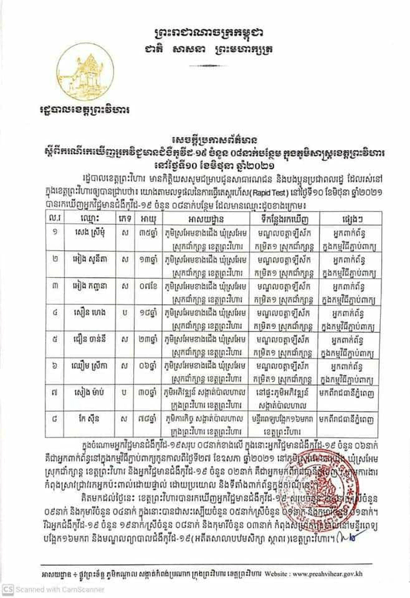 ព្រះវិហារៈ រដ្ឋបាលខេត្តព្រះវិហារ នៅរសៀលថ្ងៃទី១០ ខែមិថុនា ឆ្នាំ២០២១នេះ បានចេញ សេចក្តី ប្រកាសព័ត៌មាន ស្តីពីការរកឃើញអ្នកវិជ្ជមានជំងឺកូវីដ១៩ ចំនួន៨នាក់ទៀត ក្នុងនោះមាន ទារិកាអាយុ៧ខែម្នាក់ផងដែរ។