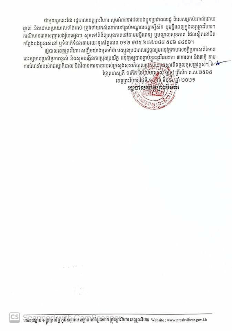 ខាងក្រោមនេះជាសេចក្តីប្រកាសរបស់រដ្ឋបាលខេត្តព្រះវិហារ៖