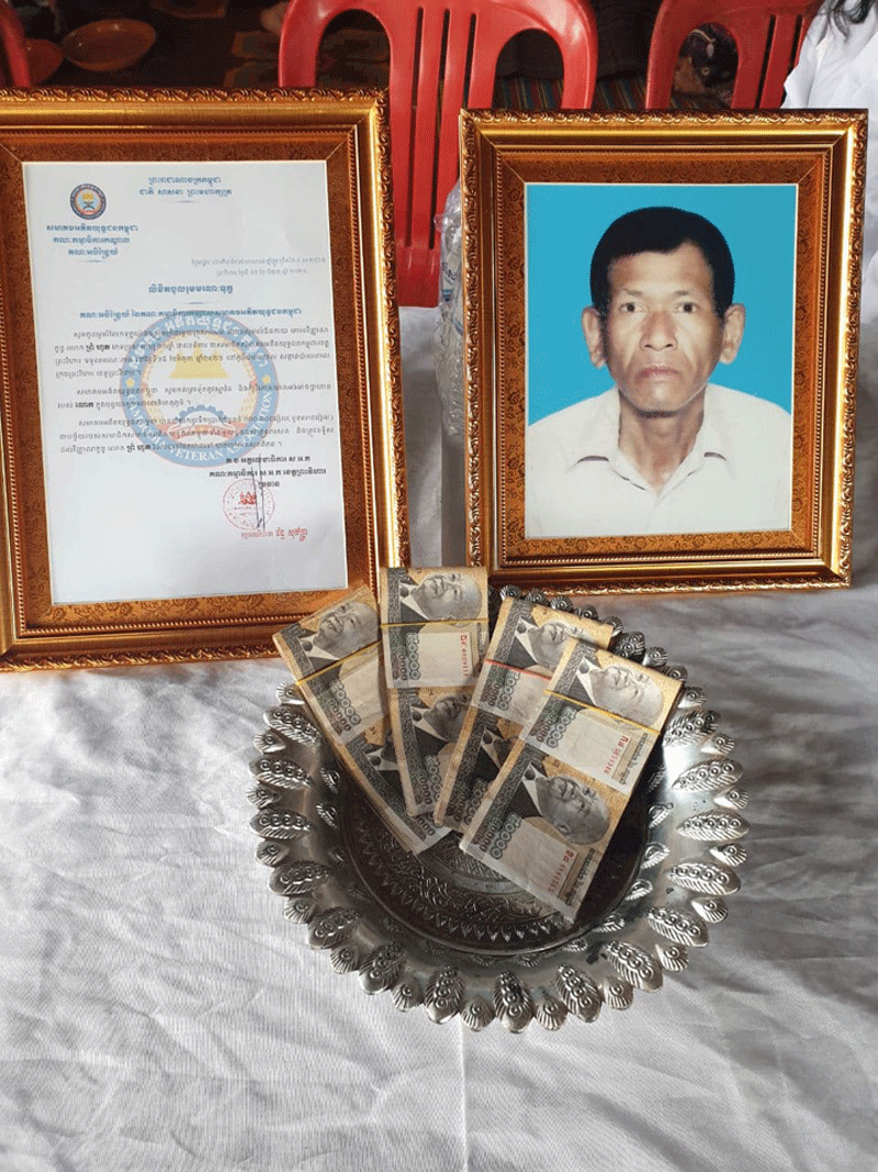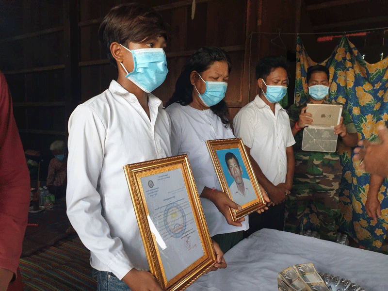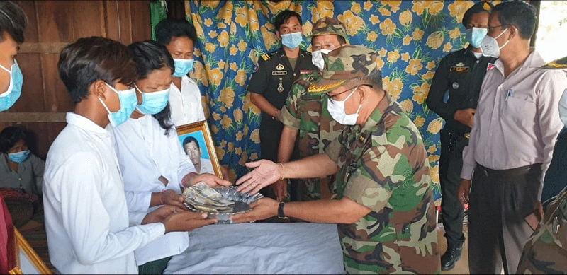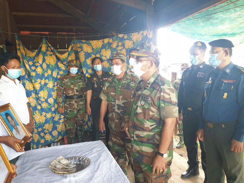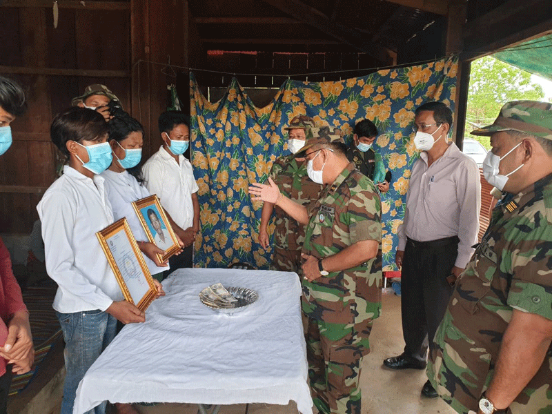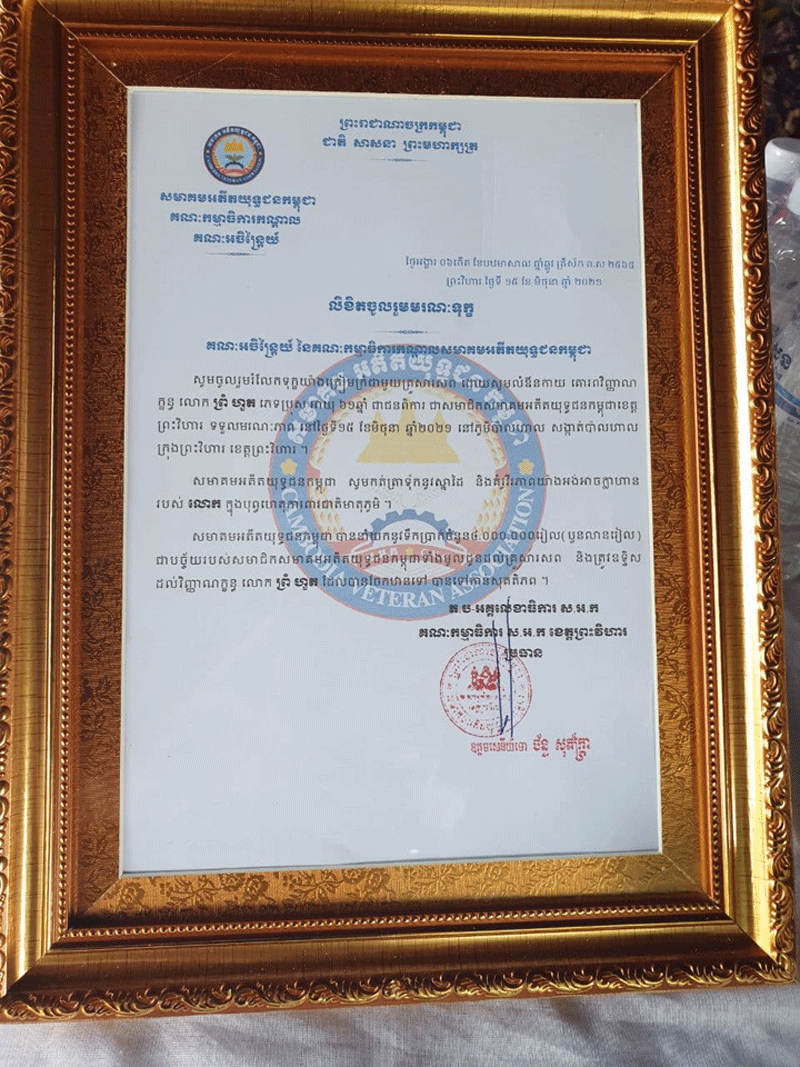 ព្រះវិហារៈ នារសៀលថ្ងៃ ទី១៥ ខែមិថុនា ឆ្នាំ២០២១នេះ ឯកឧត្តម ឧត្ដមសេនីយ៍ទោ ចន្ទ័ សុភ័ក្រ្ដា មេបញ្ជារការ តំបន់ប្រតិបត្ដិការសឹករងខេត្ត និងជាប្រធានសមាគមអតីតយុទ្ធជនកម្ពុជាខេត្ដព្រះវិហារ បានដឹកនាំក្រុមការងារសហការីមានក្រុង ស្រុក អាជ្ញាធរ ភូមិ ឃុំនិងប្រធានអនុប្រធានសាខា បានចុះប្រគល់ថវិការបេឡាមរណៈសង្គ្រោះចំនួន ៤០០០,០០០រៀល ជូនដល់គ្រួសារសពអតីត យុទ្ធជនដែលមានឈ្មោះ ព្រំ ហួត ភេទប្រុស អាយុ៦១ឆ្នាំ ជាជនពិការ ទទួលមរណៈភាព នៅថ្ងៃទី១៥ ខែមិថុនា ឆ្នាំ ២០២១នេះលេខរៀងសពទី១៦៨រយៈពេល៦ឆ្នាំ គិតពីឆ្នាំ២០១៦មក ទល់២០២១នេះ នៅគេហដ្ឋានរបស់សព ស្ថិតនៅភូមិប៉ាលហាល សង្កាត់ប៉ាលហាល ក្រុងព្រះវិហារ ខេត្តព្រះវិហារ ។ ឯកឧត្ដម ប្រធានសមាគមន៍បានមានប្រសាសន៍ថា នេះមានការសោកស្ដាយជាពន់ ពេកនូវវរៈយុទ្ធជន ដែលមានចិត្តអង់អាចក្លាហាន ក្នុងការរួមចំណែកការពារមាតុភូមិនិងស្ដា ប្រទេស ឲ្យរួចផុតពីភ្លើង សង្រ្គាមដ៍រាំរៃក្លាយទៅជាប្រទេសមានសុខសន្តិភាព ពេញលិញនិងមានការអភិវឌ្ឍន៍ គ្រប់ទឹសទីក្រោម នយោបាយ ឈ្នះ ឈ្នះ របស់សម្ដេច តេជោ ជាថ្នាក់ដឹកនាំ។