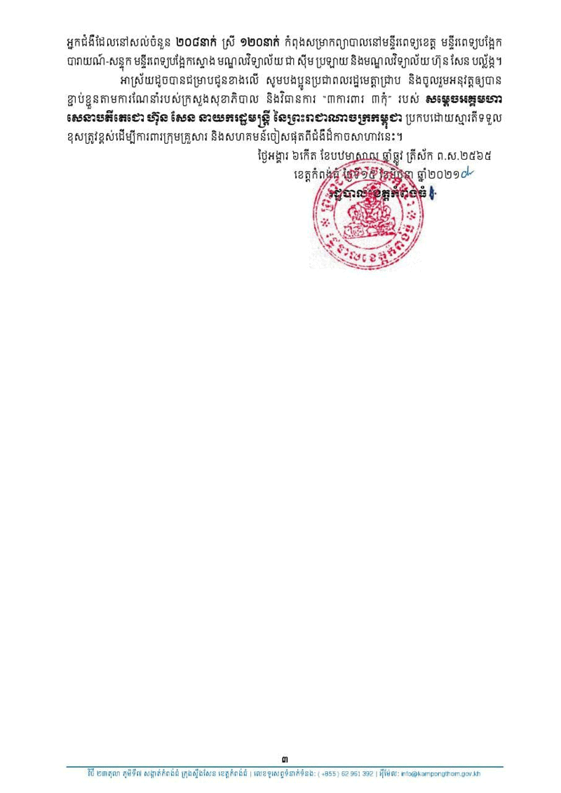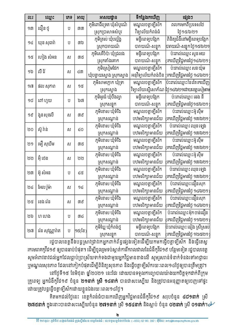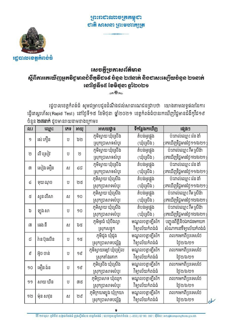 សេចក្តីប្រកាសព័ត៌មានរបស់រដ្ឋបាលខេត្តកំពង់ធំ ស្តីពីការរកឃើញអ្នកវិជ្ជមាន ជំងឺកូវីដ១៩ ចំនួន ២៧នាក់ ដោយការធ្វើតេស្តរហ័ស (Rapid Test) និងជាសះស្បើយចំនួន ២១នាក់ នៅថ្ងៃទី១៥ ខែមិថុនា ឆ្នាំ២០២១នេះ ។
