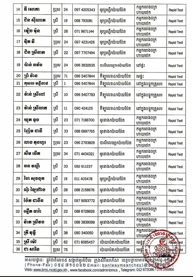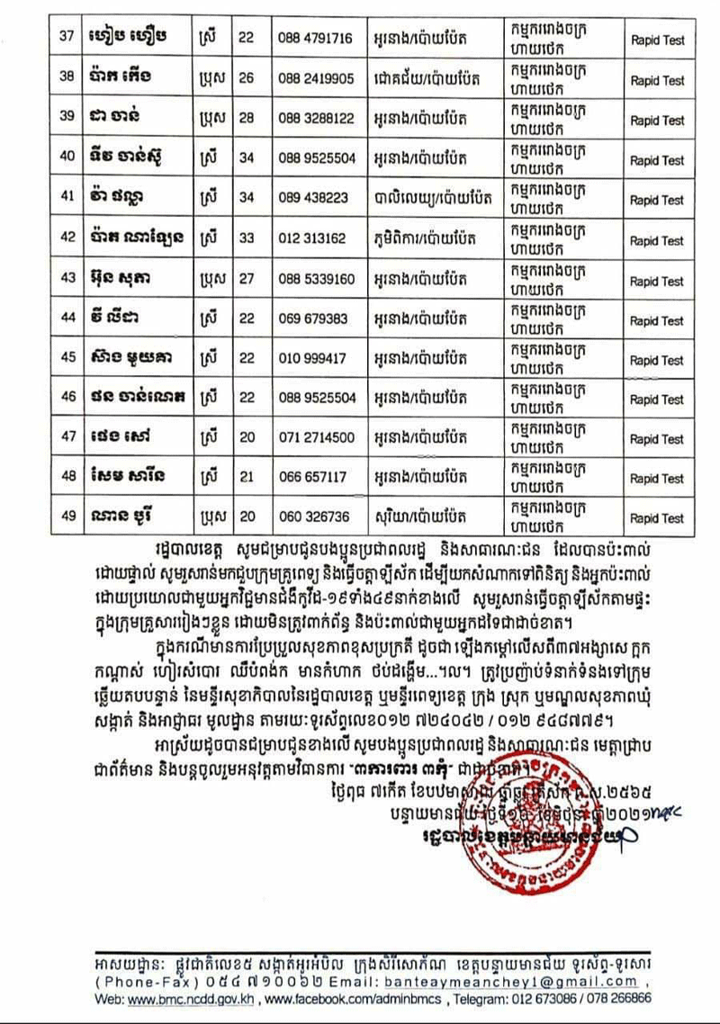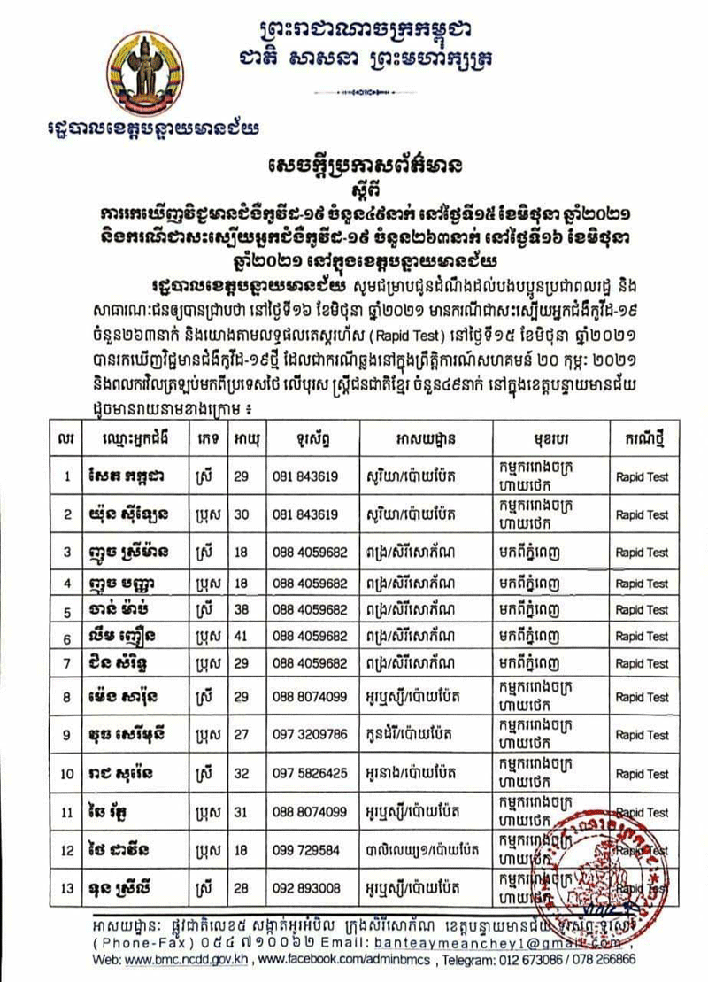 យោងតាមសេចក្តីប្រកាសព័ត៌មានរបស់រដ្ឋបាលខេត្តបន្ទាយមានជ័យ នៅថ្ងៃទី16 ខែមិថុនា ឆ្នាំ2021 នេះបញ្ជាក់ថា រកឃើញអ្នកវិជ្ជមានកូវីដ-19 មានចំនួន49នាក់ និងអ្នកជាសៈស្បើយមានចំនួន263នាក់៕